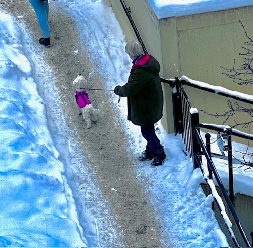 Många små hundar och färre stora hundar passerar under mitt sovrumsfönster på den här gatan med mattar och hussar på sina motionsrundor.