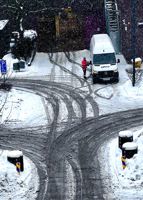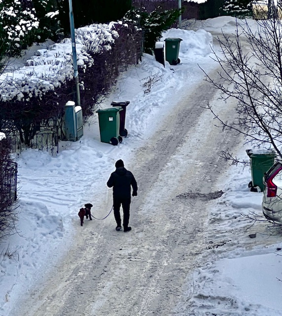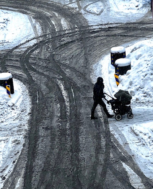 Från köksfönstret ser man leveransvägarna till Centrum för varor, personer, vårdcentralen och rehab och stundtals är det intensiv trafik, vi beundrar ofta hur man klarar sina stora varubussar och annat i trängseln utan krockar och hårda ord.