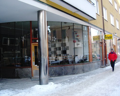 I kvarteret bredvid fanns ett nybyggt huskomplex med metallklädda pelare i entrén och synlig hiss med glasväggar runt och många ingångar längre in på gården, man hade bebyggt nästan ett helt kvarter med HSB-lägenheter. Min vana att gå runt och orientera mej var inte så lyckad här. Den fina pelargången in till lägenhetsområdet var öppen och inbjudande med tobaksaffär, skomakare och sybehörsaffär som låg i entréplanet och huset böjde av in mot en fin nyanlagd gård med buskar och grönt. I de moderna lägenheterna fanns familjer med barn, särskilt småpojkar och de hade tagit som sin uppgift att bevaka så att inga obehöriga kom in på deras område. En var värre än de andra, han hette Hasse och var alldeles vild och hans knytnävar var vassa, där fick jag hårdhänt stryk. Han fick senare sällskap med en annan stridsglad pojke som kom att bli skådespelare och jag har aldrig kunnat gilla honom. Men jag lärde mej att se mej om mycket noga innan jag gick till tobaksaffären eller någon annanstans utanför min port. De hårdhänta var ju inte alltid där, så ibland var det lugnt men det hjälpte inte att bo länge på platsen för att till slut bli bekant med dom, de förblev arga främlingar och som uppväxta stod de sedan på pass ett par tre åt gången med händerna i byxfickorna och höll uppsikt över gatan.