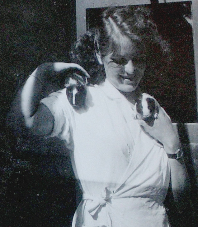 Efter tre månader blev jag anställd med lägsta lön men jag var forttfarande kvar hos råttorna och samtidigt uppvaktade jag cheferna på kemisk-tekniska avdelningen för att få byta till djurfritt arbete. Jag tyckte om djuren och de vita råttorna var som små isbjörnar i miniatyr, sånär som på svansarna. Jag hade gärna haft dem hemma som sällskap och en dag bar jag hem en i en låda för att visa mamma. Hon skrek och vägrade röra råttan men jag gjorde en gård åt henne i fönstret, (det är marsvin på bilden) så den skulle kunna röra sig lite fritt under natten. Nästa morgon hade den grävt upp alla krukväxterna ur sina krukor, allt låg huller om buller och det såg ut som om där varit slagsmål. Så lilla råttan fick följa med tillbaks till djurhuset.
