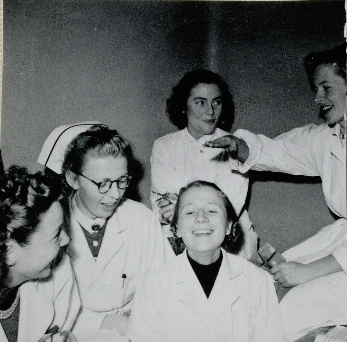 Birgit, syster Britta, Lisa, Eva och Evi i kafferummet