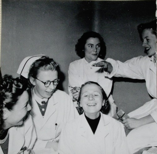 Kandidatlaboratoriet som fått maka åt sig en del på grund av Lufts verksamhet, förestods av Syster Britta och hon undervisade medicine kandidater i laboratoriearbete flera dagar i veckan. De hade behövt hela salen och det kunde bli rätt trångt när c:a 15 fullvuxna läkarkandidater rörde sej runt varandra med de fladdrande rockarna. I kandlabbets norra hörn fanns en dörr in till professor Nils Antoni och för att nå den måste man passera utmed vår arbetsbänk och det gjorde han och hans patienter och sekreterare under tystnad som teaterstatister flera gånger om dagen. Sekreteraren var stram och lite äldre och hon öppnade munnen en gång om dagen och det var på morgonen när hon kom in första gången, då utstötte hon högt så det överröstade allt ”GOMARAN” och så fick hon heta. I motsatta hörnet var diskrummet och där fanns två diskerskor Fru Palm och fröken Zander. De hade sina egna tider för kafferast och mat, de tillhörde en annan klass, så de blandade sej inte med oss annat än när det var dags för tårta, då ropade Eva på dem.