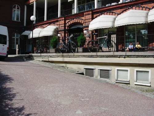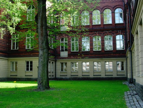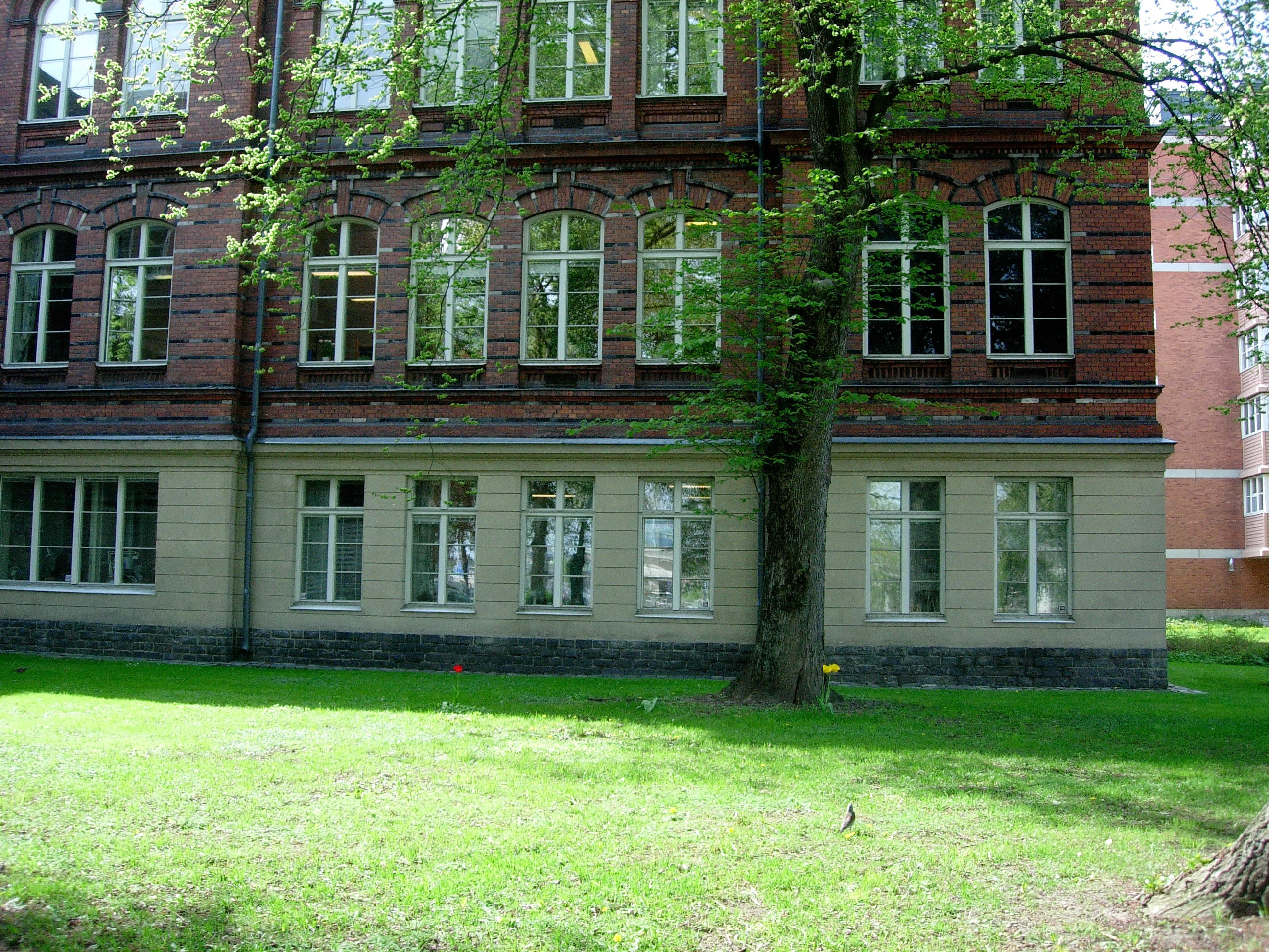 De höga fönstren i tegelfasaden längs till höger tillhörde professor Antonis rum, de fyra (eller sex?) till vänster om var kandidatlaboratoriets.