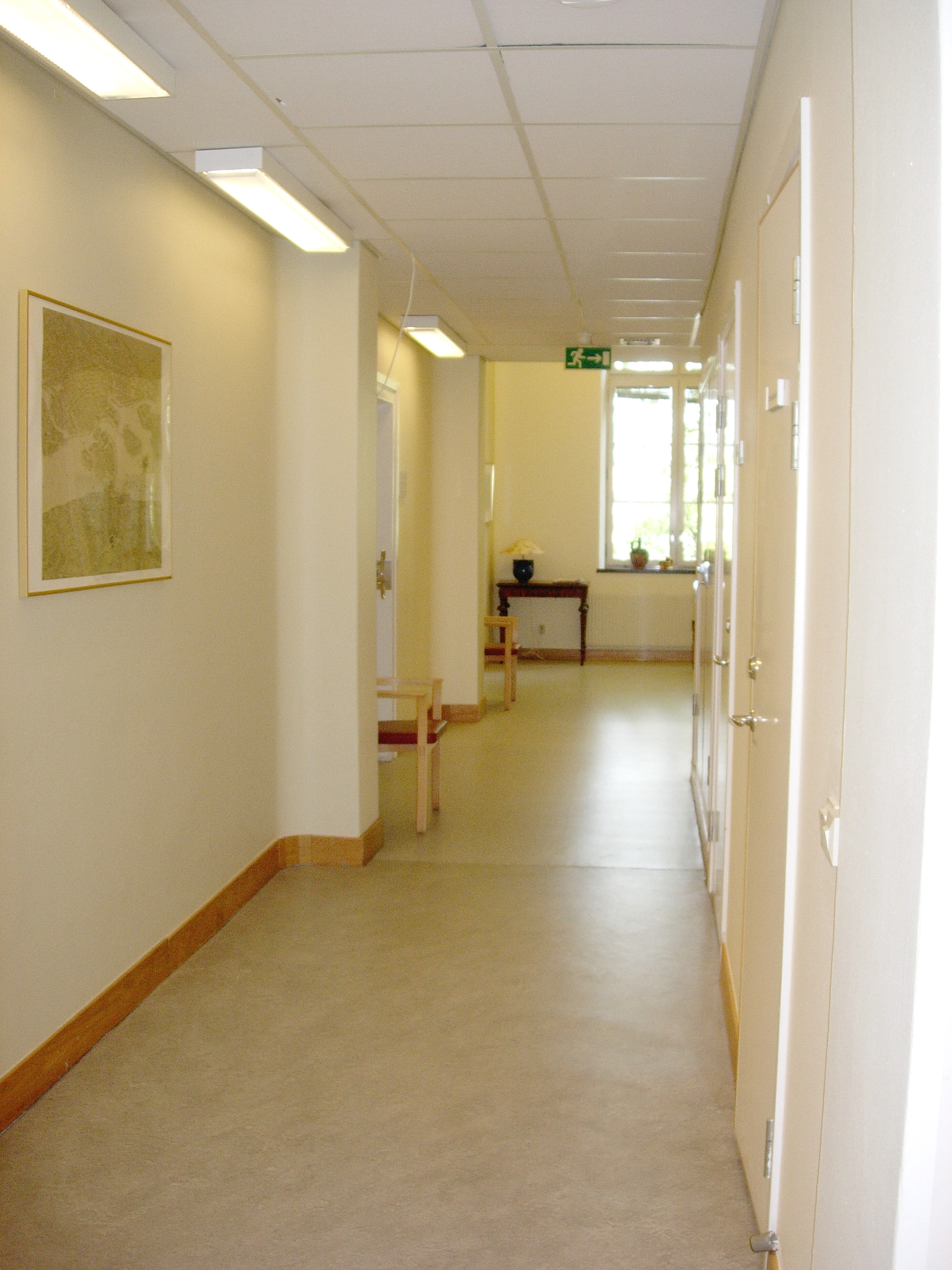 Nu är det bara ytterväggarna som skvallrar om att byggnaden är av äldre datum. Jag har inte hittat någon fotodokumentation av inredningen från sjukhusets tidigare perioder annat än bilder på fasaden och en bild som går igen i olika förstoringar från en rektoskopi-undersökning där någon med kikare spanar in i anus på en patient stående på alla fyra. Parken utanför entrén har glesats ur, stora träd har fällts, valnötsträden är borta och rosor och clematis utbytta mot småbladiga buskar som täcker hela entrén och det ligger asfalt över den gamla trappan så bilar kan köra upp till entrén.