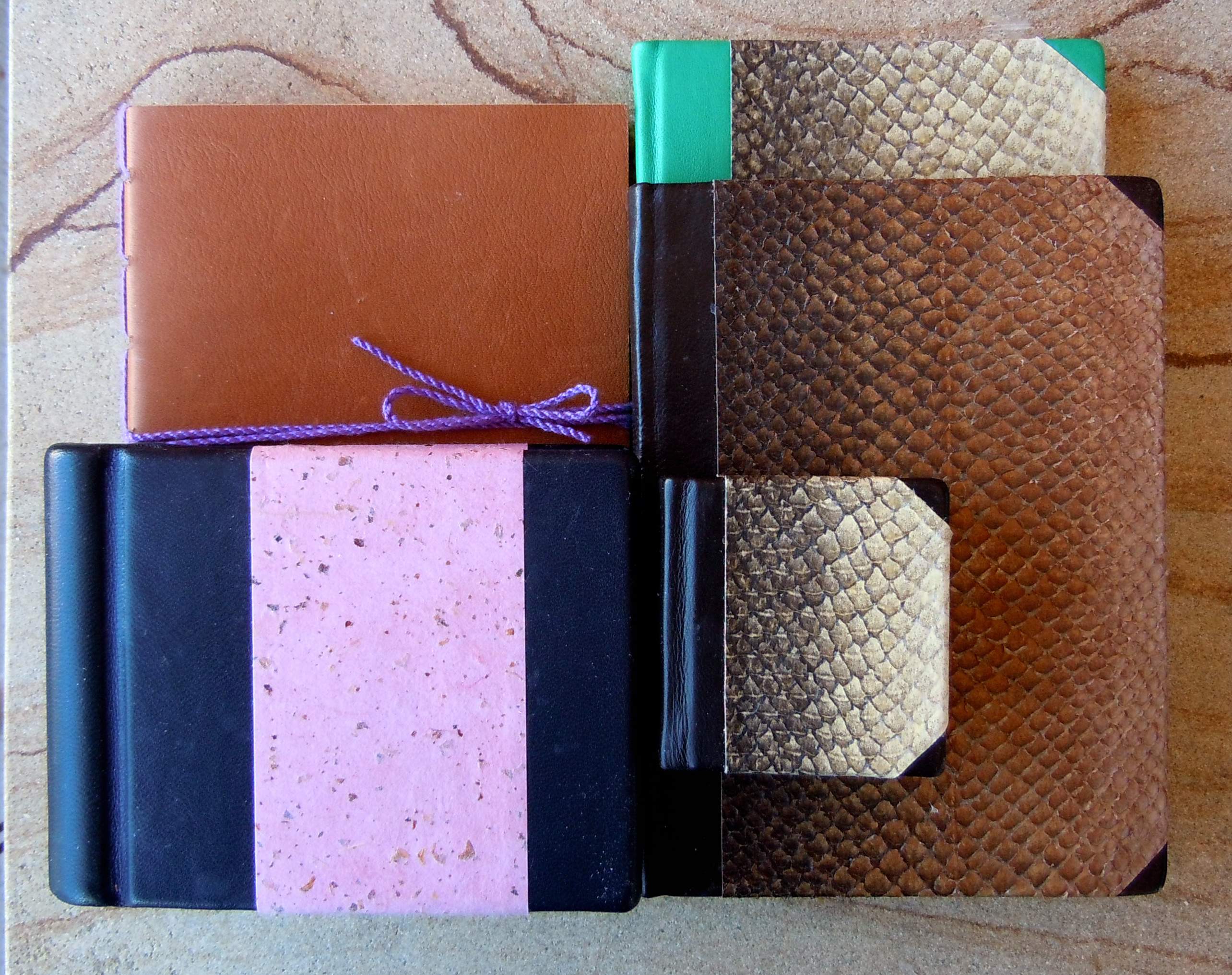 De senaste böckerna. Efter en kurs i Sigtuna hos Lotta Rahme i fiskskinnsberedning prövade jag att använda laxskinnen på några böcker.