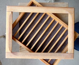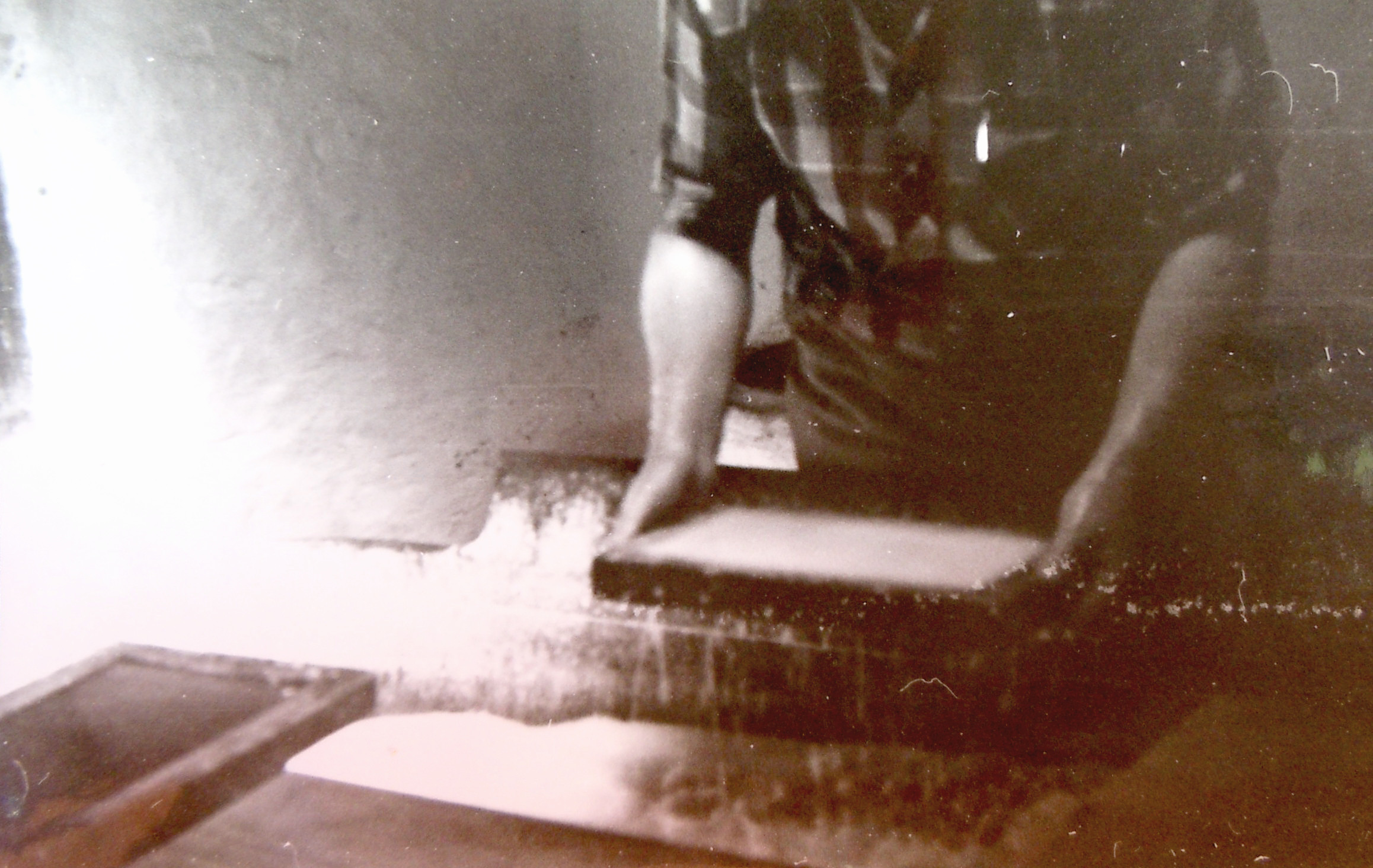 Så småningom växte tanken fram att försöka göra likadant och i stället för mosad linnelump skulle man kunna försöka med linblånor. Jag prövade men linblånorna var tunga att sönderdela och i väntan på att lyckas med dem övade jag på äggkartonger och annat papper som jag körde i en hushållsmixer till vällingkonsistens. Under lång tid använde jag ett plant rostfritt nät (jag hittat i garaget) för att fånga upp pappersmassan med och det fungerade även utan ram. Papper känner alla till men få har varit i närheten av att själva göra något. Därför blev det väldigt upskattat när jag tog med papperstillverkning på slutet av spinnkurserna och vi klippte ner linblånor i pappersmassan. Det kändes nytt och oprövat och det fanns inga skrivna eller nedärvda regler att följa och var och en hittade sitt eget sätt att fånga upp pappersmassan. De få handpappersbruk som då hade överlevt i Sverige och som bevarade det stränga hantverket var inga stora utflyktsmål och kända av ett fåtal.
