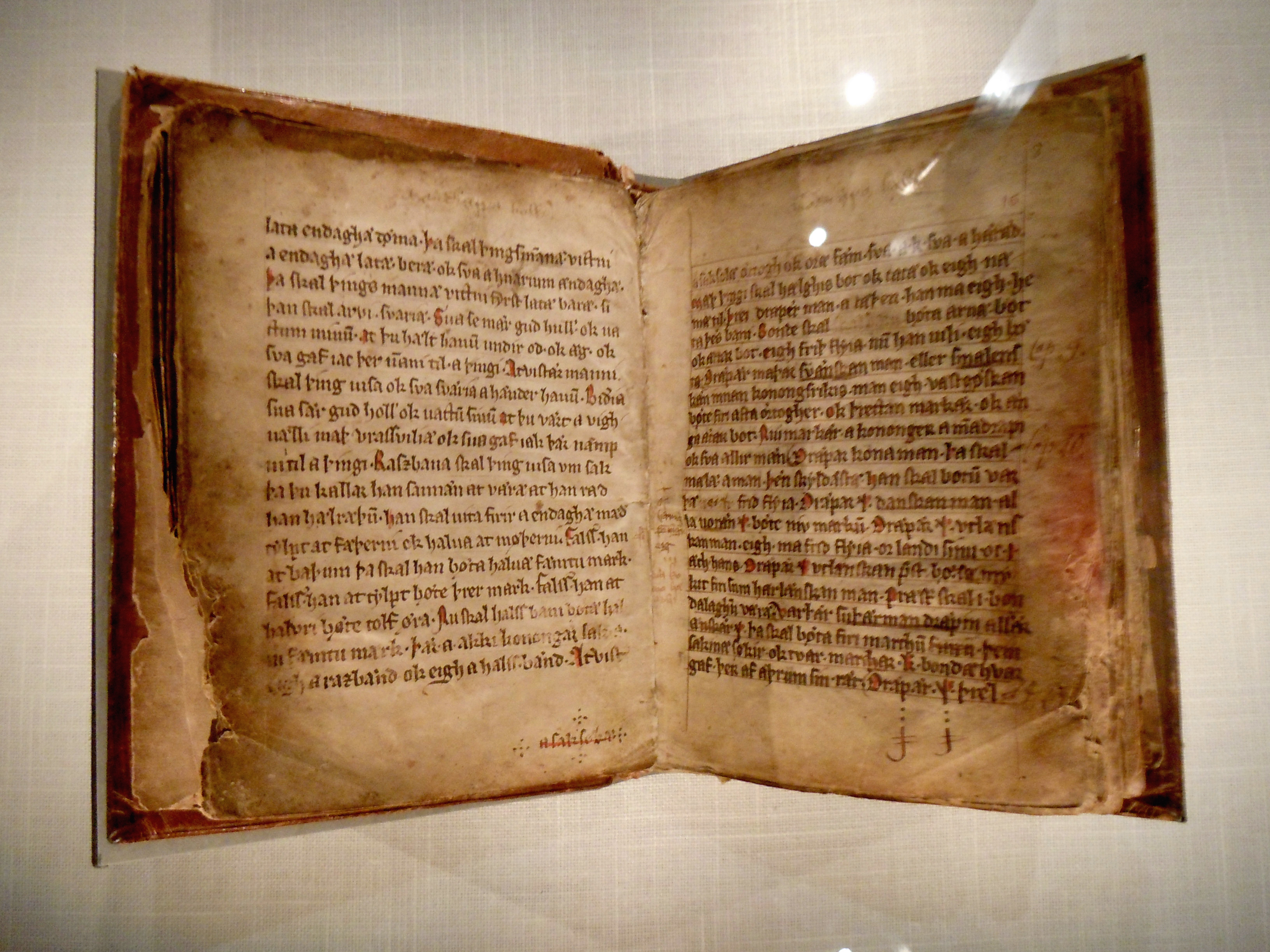 Vi passerade Skara på vår väg söderut och ville titta in i Domkyrkan, hade glömt att vi var här för tio år sedan och överraskades av Bo Beskows glasmosaikfönster bland alla de äldre färgsprakande fönstren. Den här gången hade Lasse rullator och kring kyrkan var marken lagd med rund kullersten som inte gick att ta sej förbi, vi såg att en slät gång strök utmed kyrkväggen men den fanns det ingen öppning till förrän vi gått runt halva kvarteret. Hm. Väl inne i helgedomen möttes vi av reklam för hur öppen och levande kyrkan var och kring väggarna hade olika grupper sina mötesplatser eller kor, dekorerade med saker som syftade på just den gruppen. Det kändes som ett desperat försök av kyrkan att till varje pris fånga upp alla tänkbara intressen och ge dem plats i den annars tomma lokalen. Eftersom vi inte i vanliga fall går i kyrkan för att höra en präst tolka bibelord, har vi inte hängt med i vad som händer och hur man försöker fylla de allt tommare kyrkorummen. Pilar visade att en utställning pågick i gamla biblioteket intill kyrkan man visade urgamla böcker bland annat äldre Västgötalagen, utlånad frå KB. Man läser den inte direkt av, den behöver tolkning till nusvenska men då ger den en vindpust av det är nästan tusen år sen den skrevs ner. http://svea.elte.hu/skandin/digilib/landskapslagar_aeldre.pdf