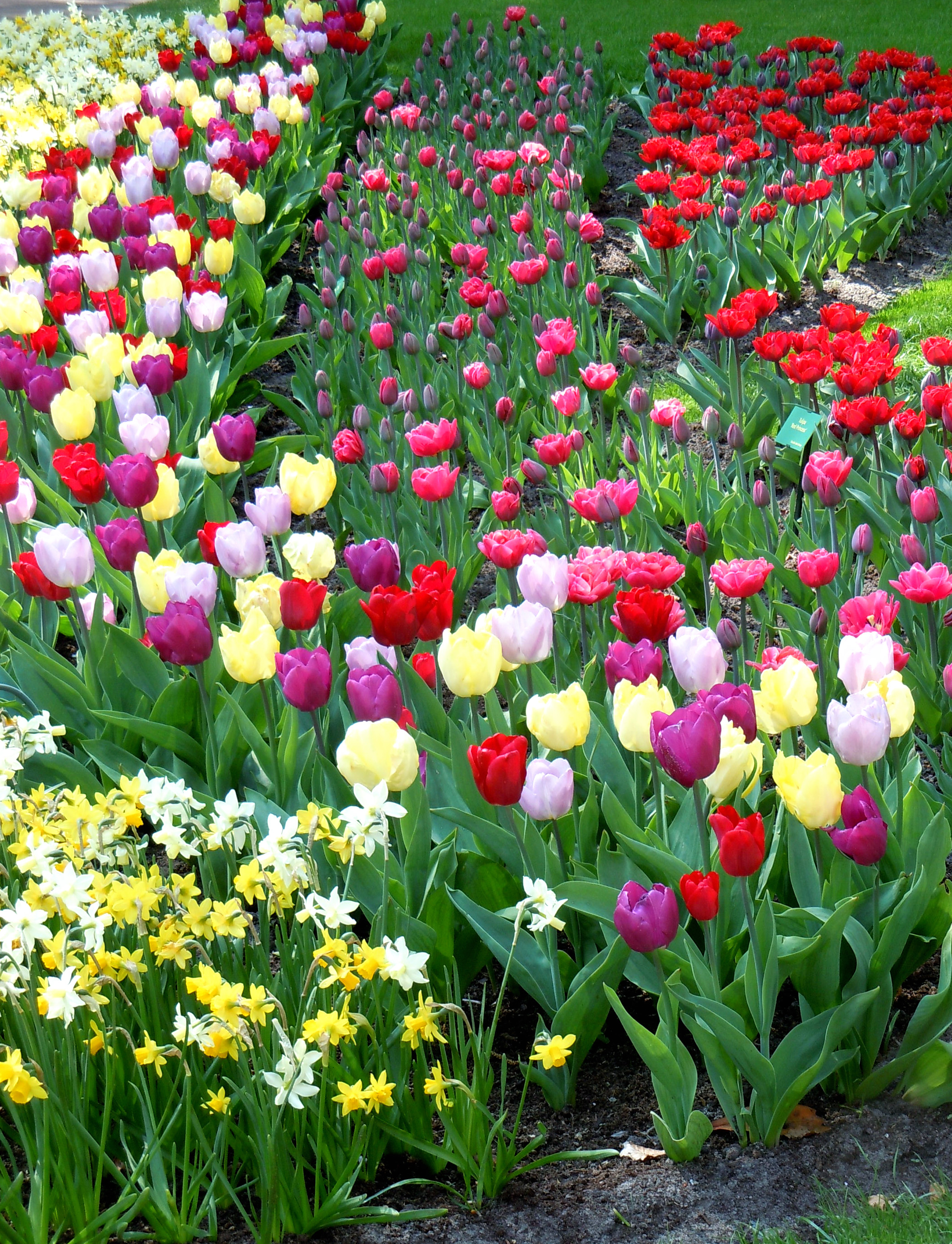 20/4 onsdag, på hotellet fick vi en vägbeskrivning till parken med tulpanerna och vi startade tidigt för att hinna se mycket under dagen. Ändå fick vi köra fram och tillbaks några gånger innan de första skyltarna dök upp. Vi anade att det kunde bli trängsel, Keukenhof är öppet bara under ett antal veckor just när tulpanerna blommar, i år från 22 mars till 20 maj. Vid ingången blev vi genast bortmotade, där var fullt och vi fick åka till en baksida där några åkrar fylldes på med rasande fart och många vakter dirigerade anstormningen av fordon med vana och allt flöt.
