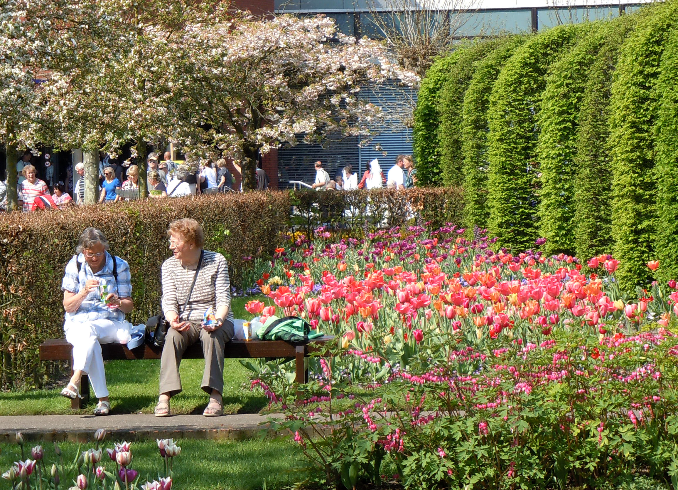 Efter en vandring mellan det ena praktfulla arrangemanget efter det andra blev besökarna nästan lika intressanta som rabatterna, där var mängder av handikappade med rullstolar och andra hjälpmedel, familjer med barn och sen vimlade det av gamlingar som vi själva. Det var gott om soffor och många hade rustat sej med smörgåsar, som man åt i den himmelskt blommande miljön. Serveringarna var väl utarbetade och mekaniserade för att sluka publiktryck och inte helt billiga och kunde man slippa att gå in där så var ett smörgåspaket hemifrån en tillgång.