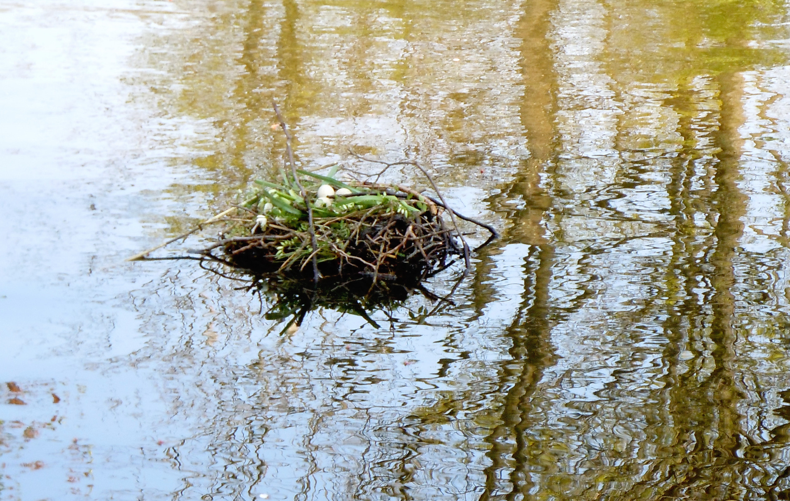 När vi framåt eftermiddagen närmade oss utgången och passerade en liten bro över en kanal fick vi vara med om en sothönas bobestyr inför alla åskådare. Hon (och han?) hade väl påbörjat boet innan parken öppnade på våren och sen när folk började dyka upp fortsatte hon och här stod vi nu på första parkett och beskådade hur hon putsade boet som hon hade fodrat  med snödroppar och sen la sej på äggen.