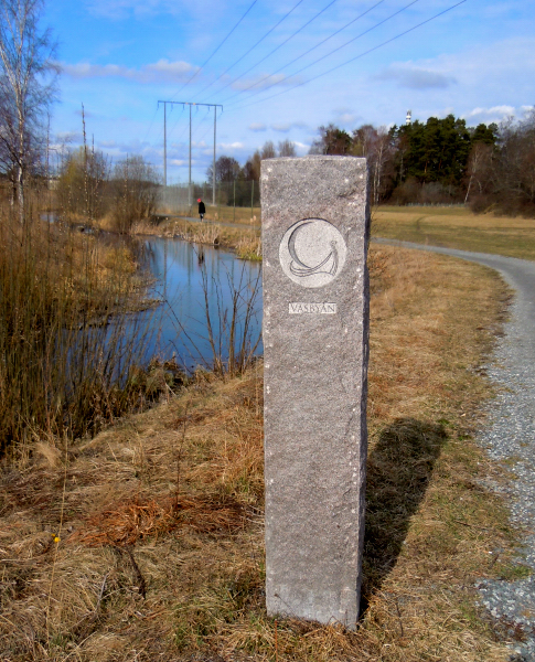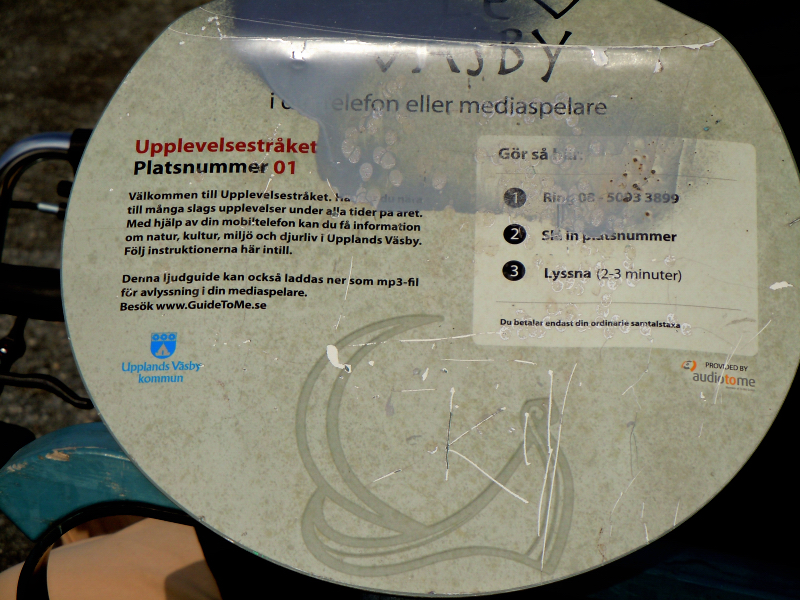 En soffa, papperskorg, en skamfilad upplysningsskylt och en huggen stenpelare med den ingraverade signaturen ”vikingabåt” visar att det här är början eller slutet på en ”etapp”. På skylten finns ett telefonnummer man kan ringa för att få veta något, ja kan man det?.