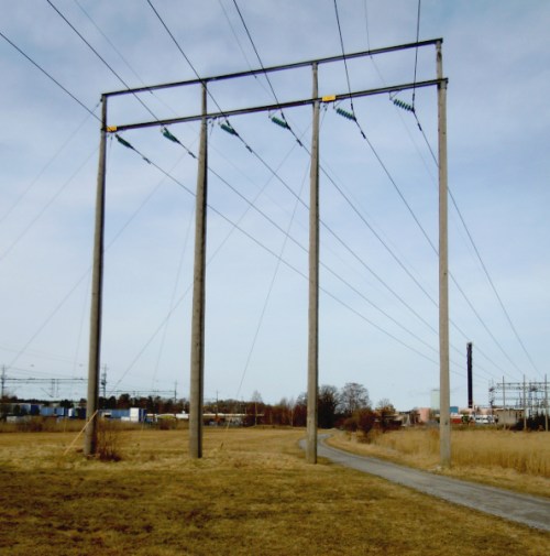 På håll ser man något portliknande, fyra höga stolpar som bär upp elledningar från ställverket, det ser ut som en japansk tempelentré ute till havs. Då man kommer närmare häpnar man över höjden, stolparna är dessutom av trä och dubblade. Det är sällan man kommer nära ledningsstolpar av den här storleken och här blir det närkontakt. Hur höga är de och vilket slags trä kan bli så här högt och var hämtar man stockar av den här längden. Vem kan man fråga?