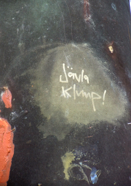Innan dungen tar slut finns ett par vattensamlingar på höger sida och i en av groparna har man placerat en av Axel Nordells ( 1914-1997) plastskulpturer. Den här är grå och brun i flera nyanser (lagningar) och formen är Nordellskt ”organisk” och om den uttrycker något så är det möjligen att den är ledsen över placeringen. Senare under sommaren då grönskan tränger upp försvinner den helt bakom den höga floran. Något står skrivet i det grå och då man går närmare ser man att det uttrycker en spontan reaktion.