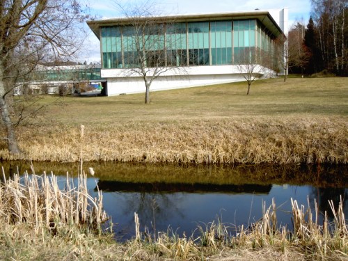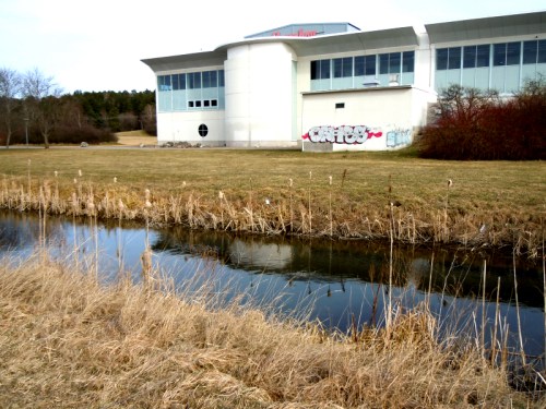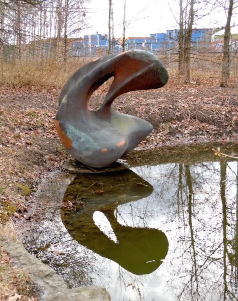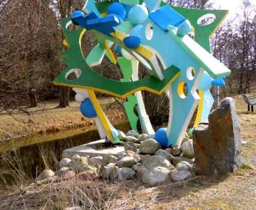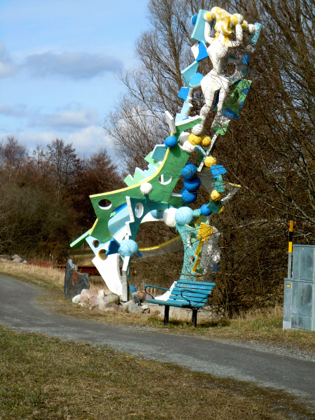 Sen är Afrodite nästa upplevelse, hennes vindlande väg har jag beskrivit tidigare, konstnären Bengt Erik Amundin dog för något mer än ett år sedan, han blev 95 år. Den vittrande plasten har lagats och målningen har bättrats på så det inte ser så skräpigt ut på nära håll. Har skulpturen haft fasadbelysning eller vad är det som ligger trasigt vid ena sidan i gräset? Och alla stenbumlingarna som är strödda nertill och vad menas med den stora stenen med raka sidor som står snett framför? Här finns i alla fall en soffa och därifrån kan man ”uppleva dagvatterdammarna på nära håll”.