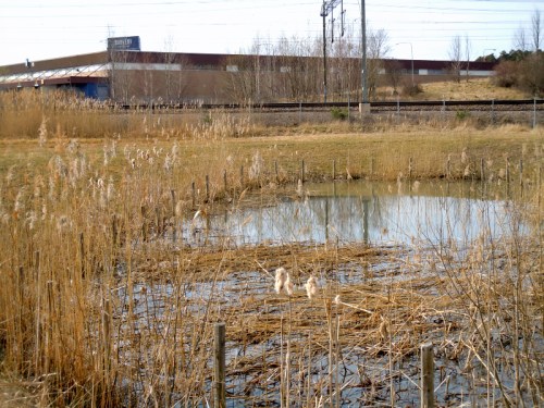 Sedan öppnar sej fält där man längre bort grävt ut dammar för dagvattenrening och den uppgrävda leran har samlats och lagts så det påminner något om gravhögar. På flera ställen utmed stråket finns soffor utplacerade så man kan sitta ner och vila lite och kanske förundras över det antal tåg som svischar förbi. Vi räknade en söndageftermiddag, på sträckan mellan stationen och Älvsunda och tillbaks på c:a en timme passerade 28 tåg.