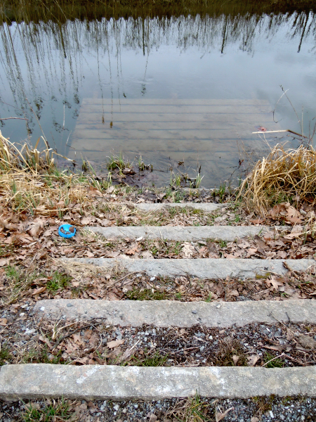 En trappa av huggen sten leder ner till vattnet och under vattnet skymtar en träplattform, det påminner om en tilläggsplats gör gondoler, när byggdes den och varför? Provtagningsplats för vattenprover?
