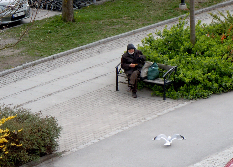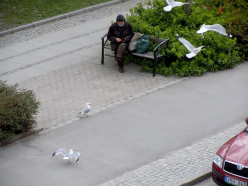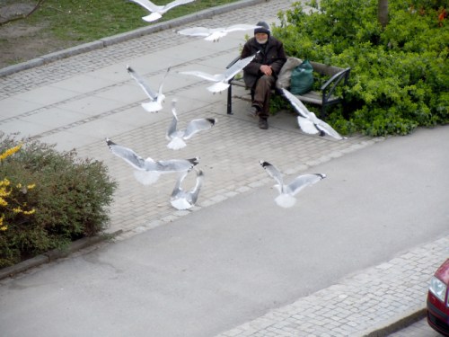Ja vi har en hel del måsar, jag har undrat var de häckar och kanske är det på taken, vi har en del platta tak också men vi har inte hört om några överfall. Mannen på bilden brukade mata måsarna med bröd och kastade det några meter ifrån sej, så fåglarna kom aldrig riktigt nära honom.