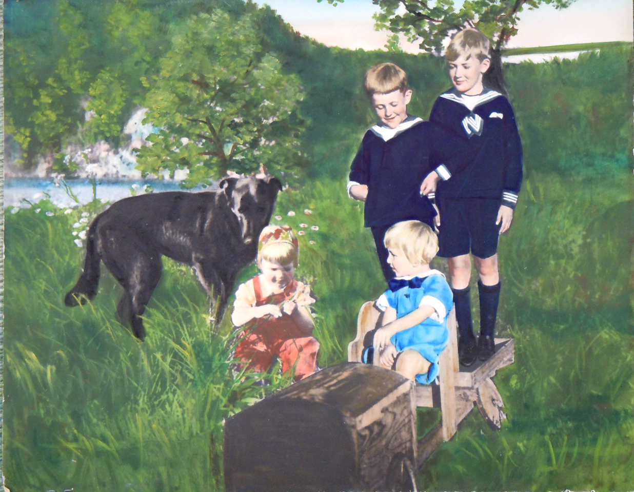 Färglagd bild av Kalle och Gretas fyra barn, sjöarna syns i bakgrunden Flaten till höger och Albysjön till vänster, vet inte varifrån den är tagen men ett foto är det.
