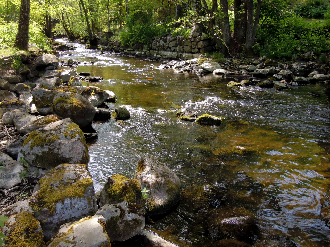 Vi hör äntligen bofinkarna och de andra sångarna, strömstaren – kändisen från Nyfors ser vi inte till och vattnet är sparsamt. Hela området är stökigt, förr kunde man urskilja strömfårorna men allt är ett enda stort stenröse med några husgrunder som sticker upp här och där.