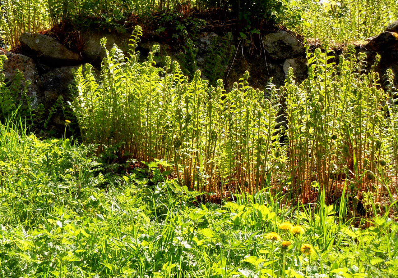 Här sticker boningshusets grundstenar upp bakom ormbunkarna