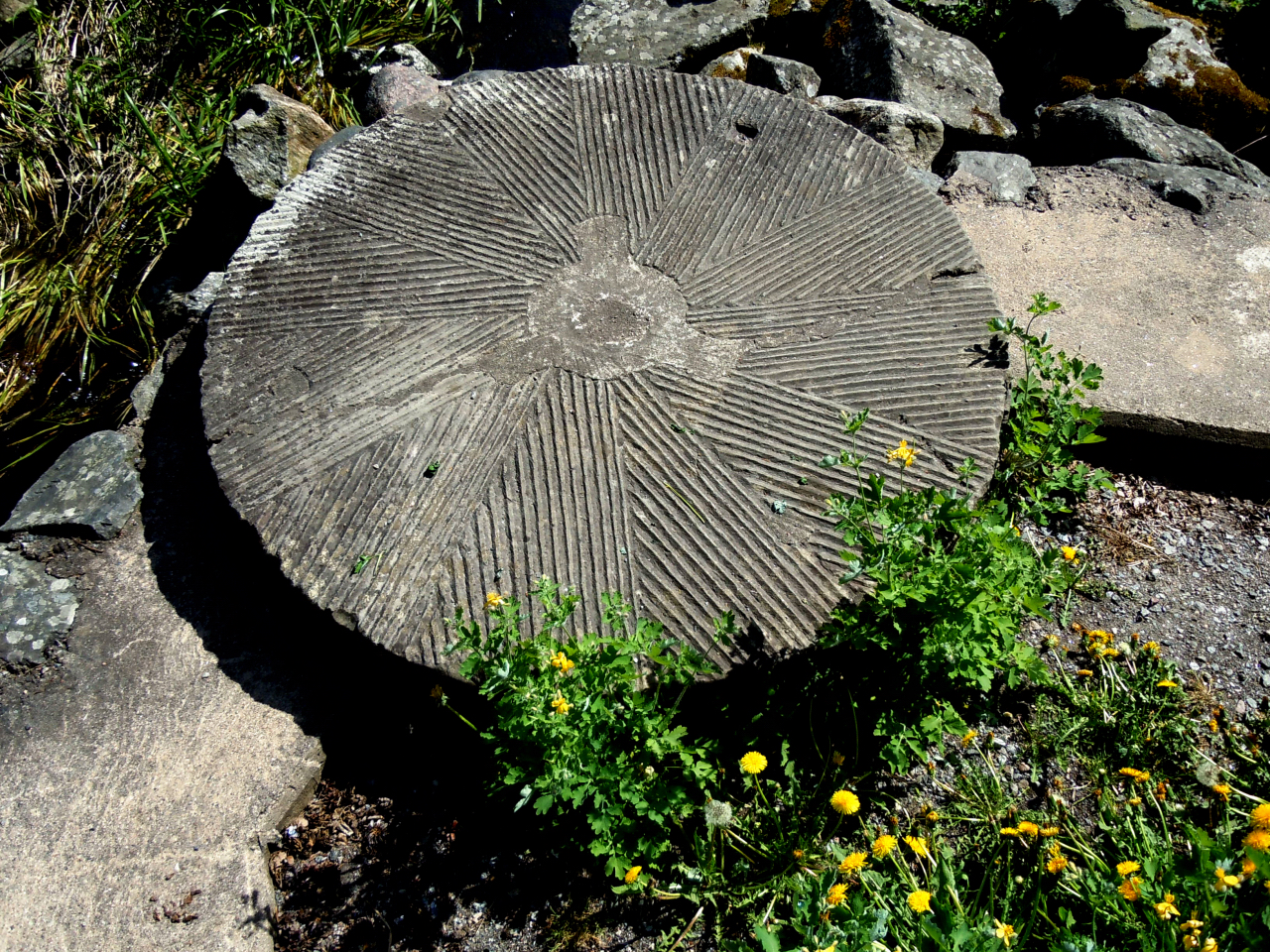 En kvarnsten ligger kvar intill en bro över strömfårorna, där kan man sitta och äta sin bulle, ingenstans för övrigt finns en plats att vila på. Stenens mönster är skärpt och vi vill tro att Lasses morfar haft något med den att göra.