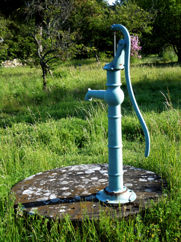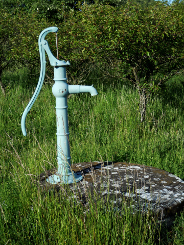Pumpen är fortfarande vår vän och särskilt när vi vill ha riktigt kallt vatten. Det händer ibland att elförsörjningen upphör antingen förannonserat eller oväntat. Då är vi ändå inte utan vatten och vi får en påminnelse om hur det var när vi fick hämta allt vatten i hink från pumpen. Den står precis där Albert Baeckström pekade ut platsen med sin slagruta.