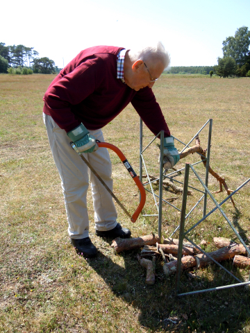 Vindkraftverket på telefonstolpen gick omkull i en kraftig blåst och vi beställde en riktig mast från Vibe och den blev ännu bättre förankrad i marken. Efter några år hade skogsranden höjt sej och släckte ut de vanligaste vindarna och till slut efter ännu ett antal år beställde vi el framdraget till stugan och det blev början på en ny tid för oss. Masten stod länge kvar som ett minne men till slut sågade Niklas ner den i sex bitar och de de utgör nu en installation framför huset och är dessutom utmärkt som sågbock.