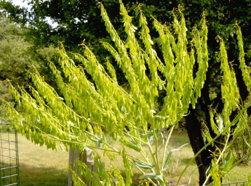 Bilden är på min sista Vejdeplanta, fröet har legat minst 20 år i ett varmt kökskåp. Jag har inte sett några uppgifter om att man odlat vejde för blåfärgning som gammal tradition i Sverige. Linné konstaterar då han sett Vejde på Öland och Gotland att ingen tycks veta att det är en färgväxt. Odling har föreslagits på 1800-talet men det gav dåligt resultat. Vi har alltså ingen egen tradition som blivit bortglömd och som det är viktigt att blåsa liv i. Men det är ändå en härlig känsla att kunna färga garn blått med bladen av en växt som går att hitta på en smal remsa vid Östersjöns bukter, strax ovanför där vattnet rör om i strandgruset.