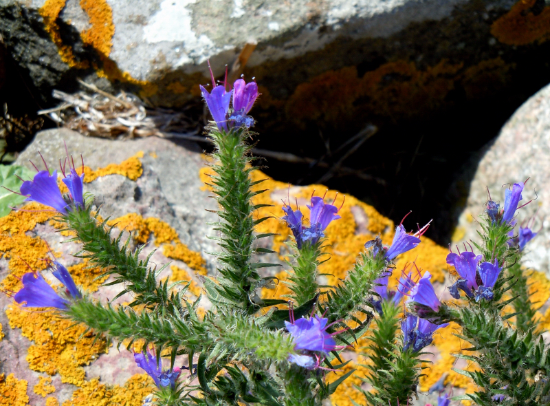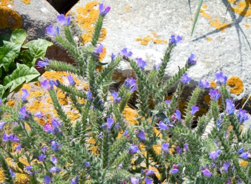 I Burgsviks hamn med nära till vattnet lyser blåeldens sista flammor och uppe på raukfältet vid Holmhällar har samma växt redan givit upp.