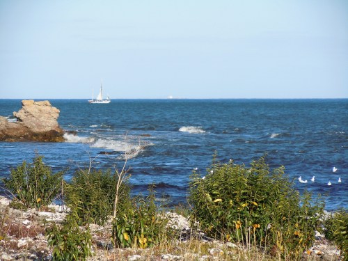 När vi är nästan framme vid nästa raukfält, Hammarshagahällar, kommer en segelbåt ut från hamnen i Vändburg, den har två master och ser lite ovanlig ut, ålderdomlig, säjer Lasse. Vi kan inte släppa den och undrar vad det är. Fisketurister? Nästan alla har väl åkt härifrån. En som bor vid nästa bukt säjer att två polska båtar legat i hamnen.