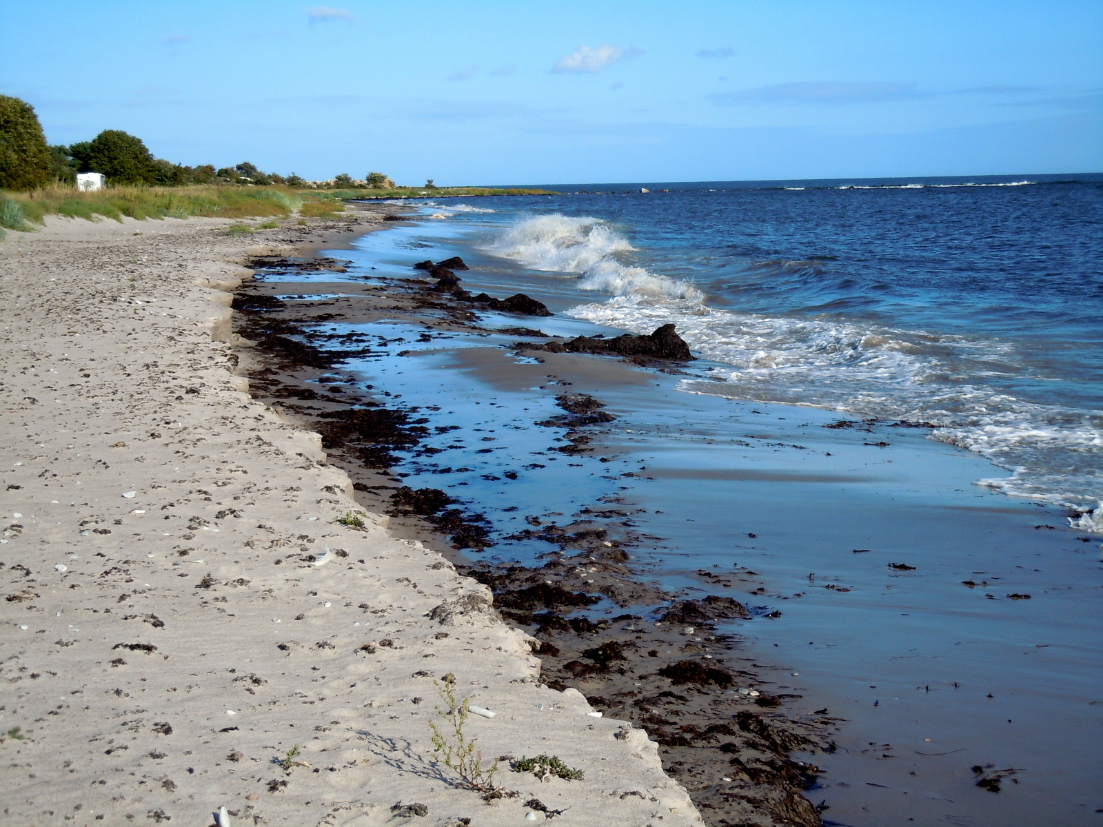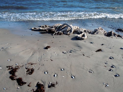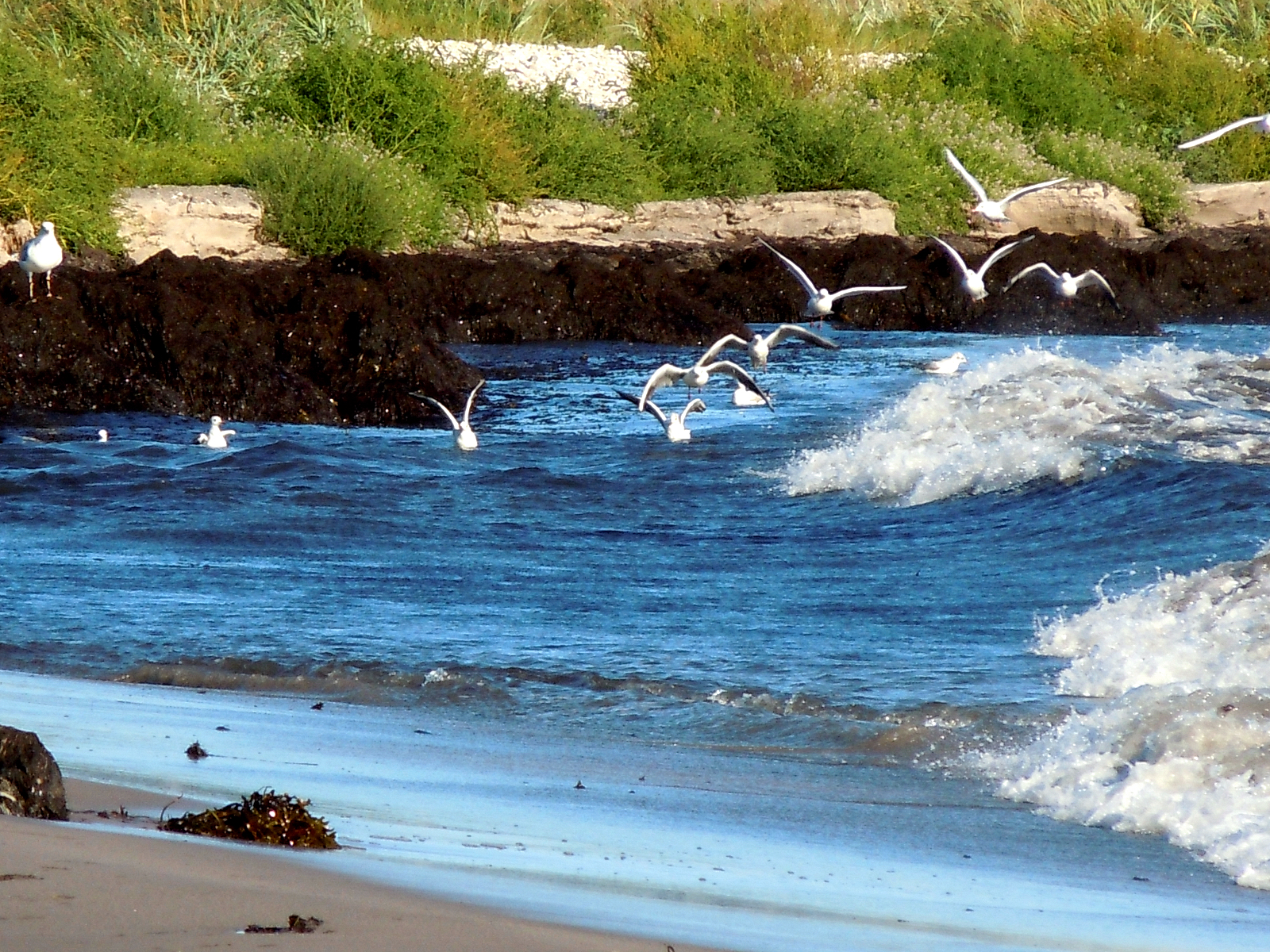 Uppriven tång eller släke samlas på vissa ställen och bildar ibland tjocka svarta strängar som ligger och ruvar intill varandra som knöliga krokodiler, efter en storm kan alltihop, man vant sej att se, ha flyttat sej till en helt annan del av stranden. Det blåser ordentligt och vi ser mängder av vita fåglar ute på vattnet och de lyfter då och då för en våg.