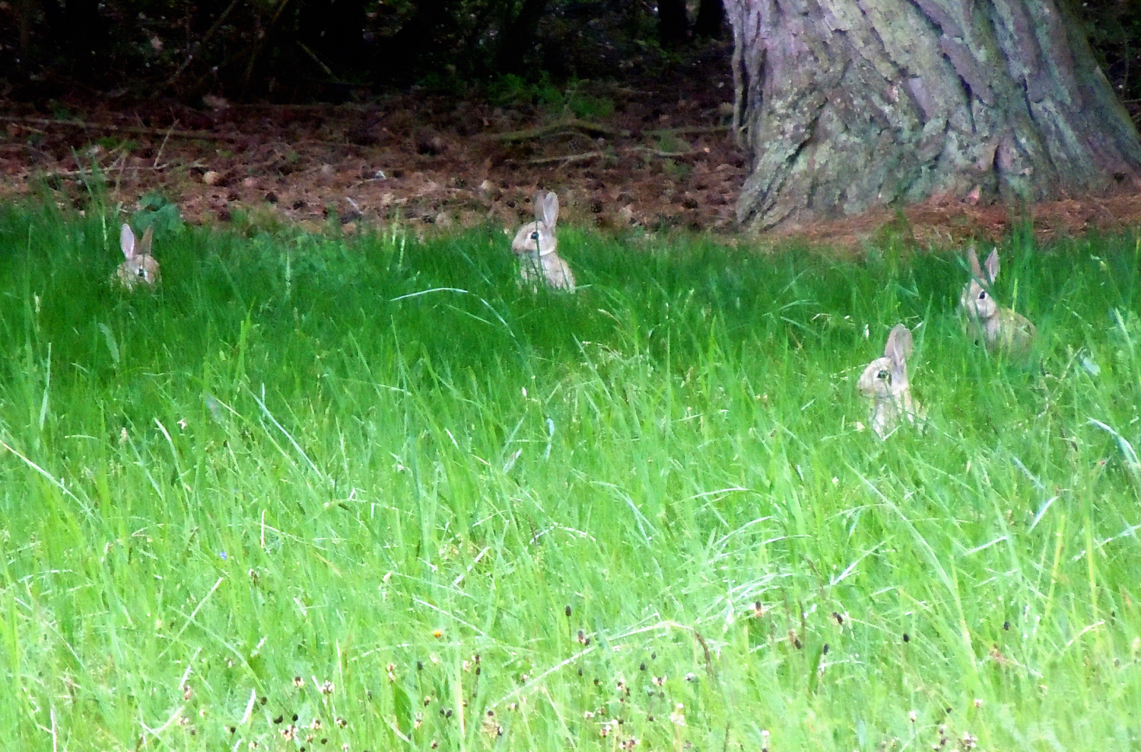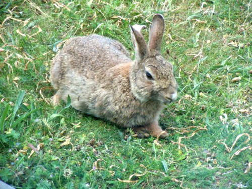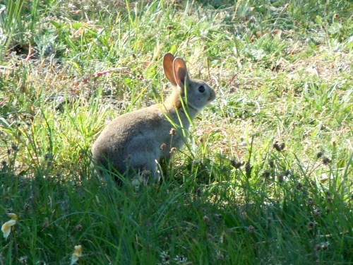 Vi såg aldrig något djur komma upp ur hålet eller gå ner där men bland alla de vildkaniner som i skymningen invaderade gårdsplanen var det en familj som vi till slut kände igen. En stor rabbis med liten vit fläck på nosen och ett kluvet öra hade alltid fyra ungar omkring sej och de små hade alla en vit fläck i pannan och en annan stor rabbis brukade vara i deras sällskap. De betade gärna på hörnet runt Ölandstoken men då årets mängd av rabbisar var så rekordartat så glömde vi att hålla reda på dem. Sommaren gick och barnfamiljerna var där med en av de väntade hundarna, men ingen brydde sej om just hålet under huset (däremot andra hål).