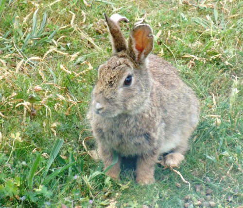 När semestrarna var slut var det vår tur att åka till ön och njuta av eftersommaren, den lugna och avslapppnade årstiden, när sådd, blomning och skörd är över. Huset hade stått tomt i några dagar och jag gick runt ett varv, på baksidan mötte jag en stor rabbis. Den övervägde att sitta kvar, när jag tilltalade den men sen satte den fart mot Ölandstoken och försvann i hålet. Den använde gången ! Vi hade sen sällskap med den i tre veckor, den betade runt tokbusken och slank ner i sin gång så fort vi kom för nära. Var han (den) frisk? Lite tufsig såg han ut, hade han en påbörjad myxomatos? Eller var det normalt pälsbyte inför den kallare årstiden.