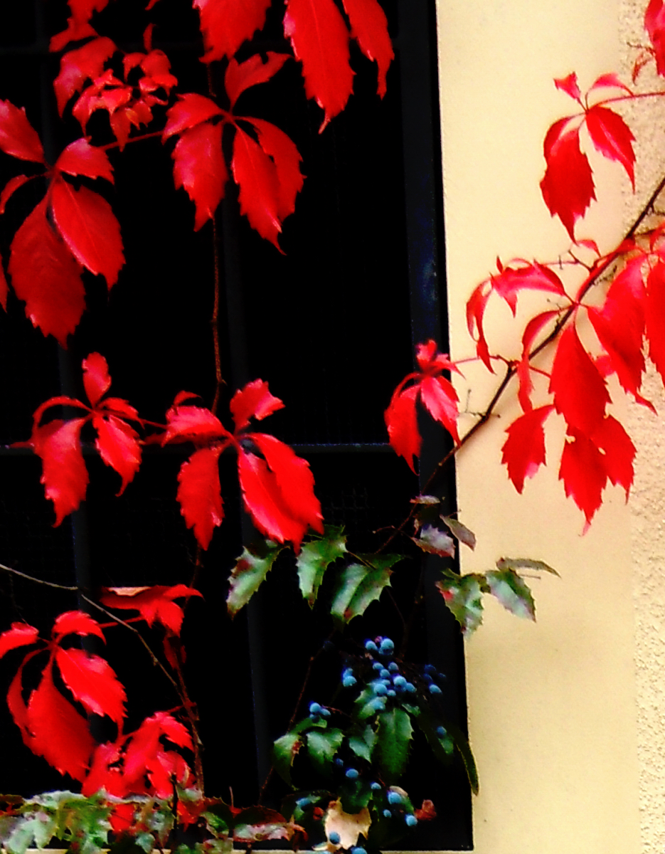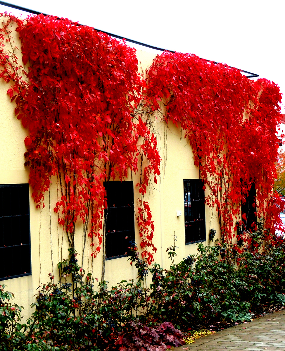 Hösten har sina fördelar, bland annat alla de skiftande färger som träd och buskar får och som så snabbt förändras. Vildvinet på garageväggen brann som bäst för 6 dagar sedan och nu är grenarna helt fria från löv.