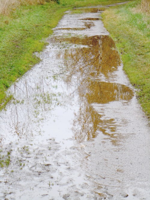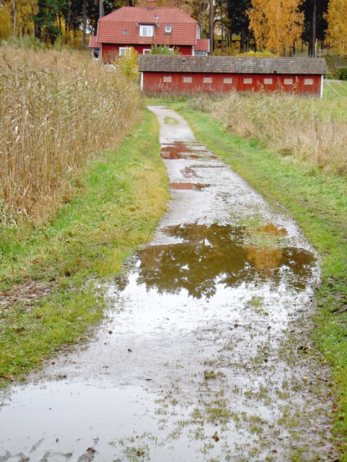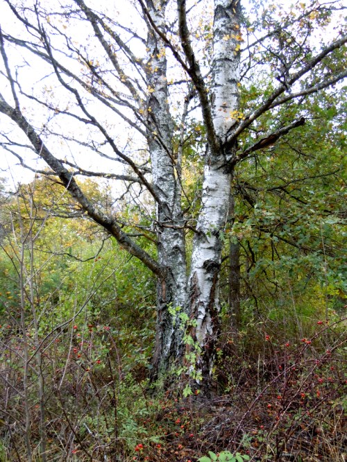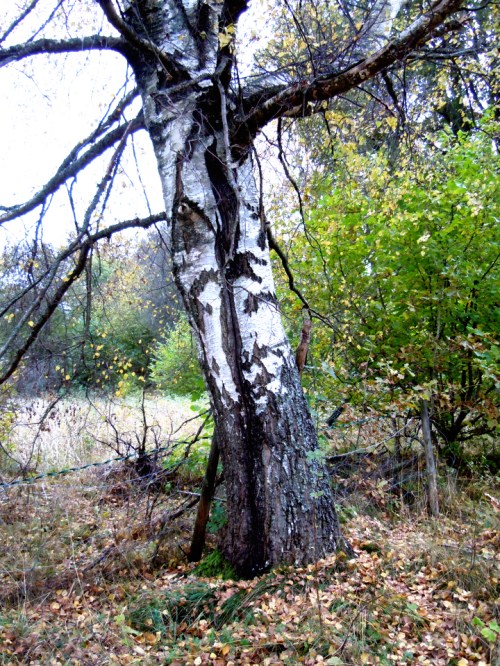 Det hade regnat hela natten och gångvägen bestod av pölar men det gick att komma förbi på gräskanten. Då vi kom upp i skogen mellan träden och buskarna gick solen i moln och plötsligt blev träden slingriga och påträngande. Urgamla björkar med spretiga grenar lite här och där som vägrade ge upp och sly, tistlar och rotvältor kantade stigen.