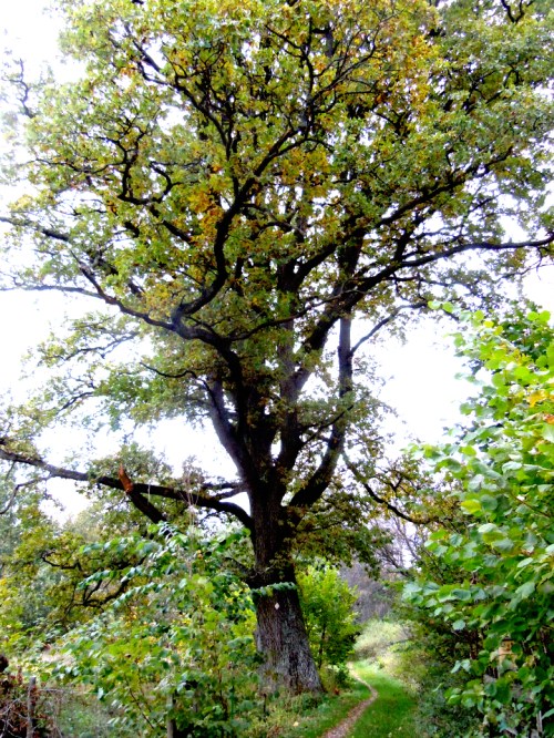 De stora ekarna, med gula nummerlappar från någon inventering, med sneda (fula) grenar och delade stammar som minner om brutal behandling under uppväxten, reser sej skräckinjagande över snåren. Skogen som en gång förvaltats av Landstinget ser nu ut att behandlas som urskog, dvs man låter allt växa och vissna som det vill.