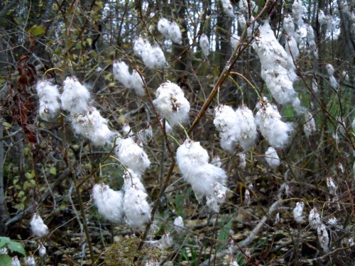 Vi kom fram till träsket där en spång med ledstång leder över, det var mycket vatten på båda sidor och djupt att titta ner i vattenspegeln, man får svindel då himlen öppnar sej mellan trädkronorna. Gräset jag hade tänkt samla hade vissnat och hängde gråbrunt i vätan och man hade behövt sjöstövlar för att komma åt det. Vid slutet av spången lyste något vitt i en buske, på nära håll såg det ut som bomullstussar, det var fröställningarna hos en variant av sälg, som jag nog aldrig sett förr. En titt i floran och jag får det till Jolster, Salix pentandra. Allt med fibrer är lockande att försöka göra garn av, de här höll inte.
