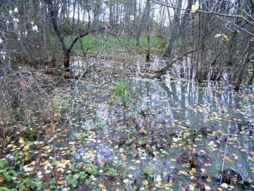 För ett par år sedan körde en stor maskin hit och dit på ofrusen mark  och skar djupa hål i slänterna, det såg ut som om avsikten var att röja sly för det låg jättehögar med grenar här och där. De ligger kvar än och snåren är om möjligt ännu tätare. Hu det var som en spökskog och det mörknade ännu mer trots att det var tidig eftermiddag.!