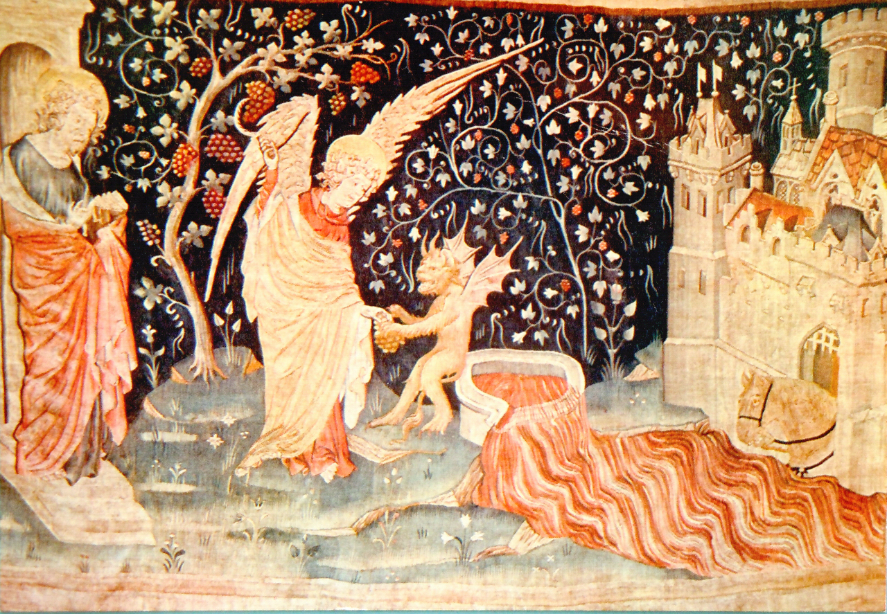 Sedan vidare utmed Loire till Angiers, där finns 75 scener ur Apokalypsen vävda på 1300-talet. De har räddats ur olika skrymslen bla har de använts att täcka potatis i källare