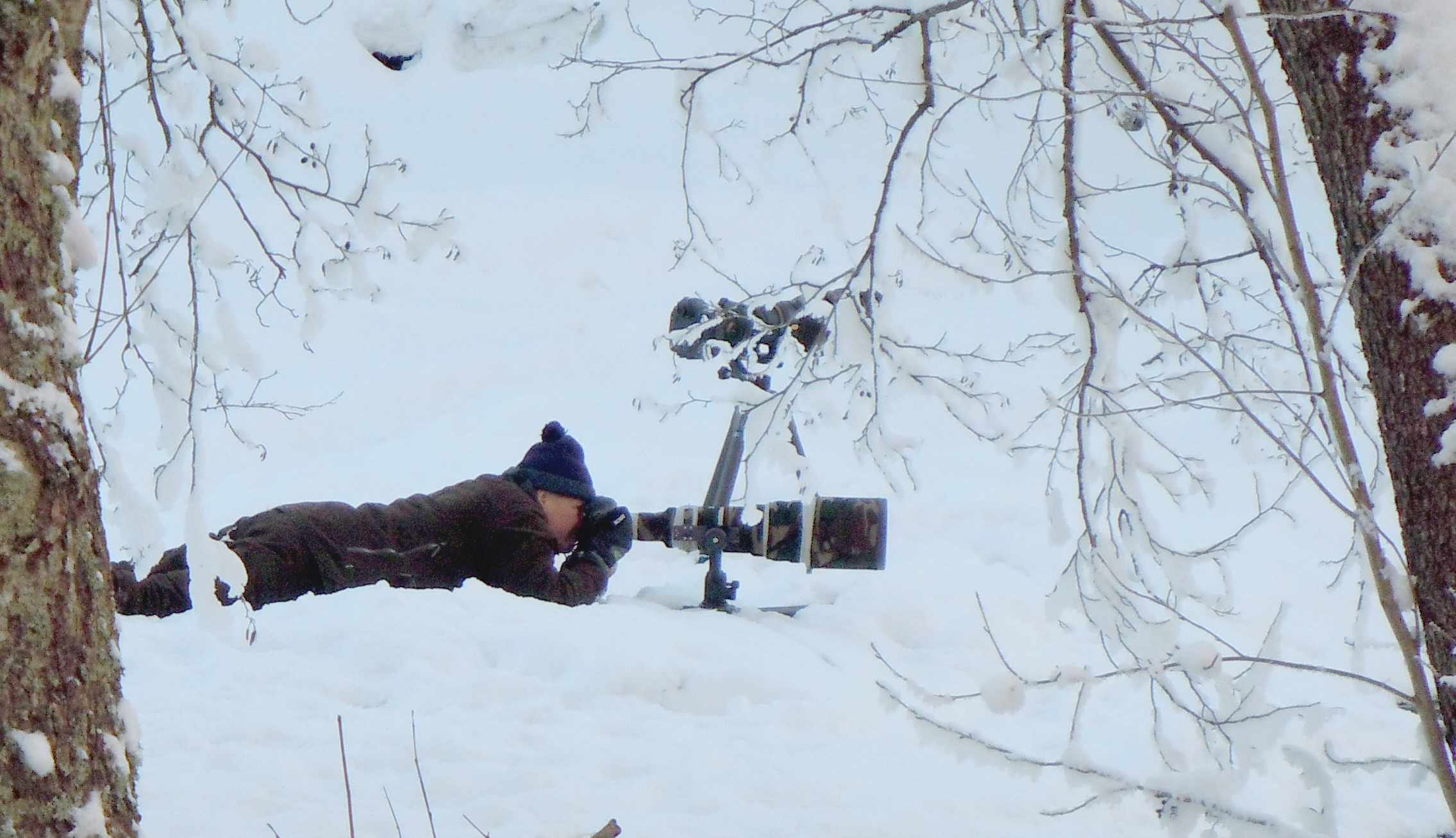 Idag, tisdag 21/1 var vi beredda att försöka igen, det var en strålande ljus dag och vägen var röjd, även parkeringen. Vi hörde bruset på håll och det första vi såg var en gestalt som låg på magen i snön med en kanonliknade kamera förlängd med plåtburkar, en fågelfotograf.
