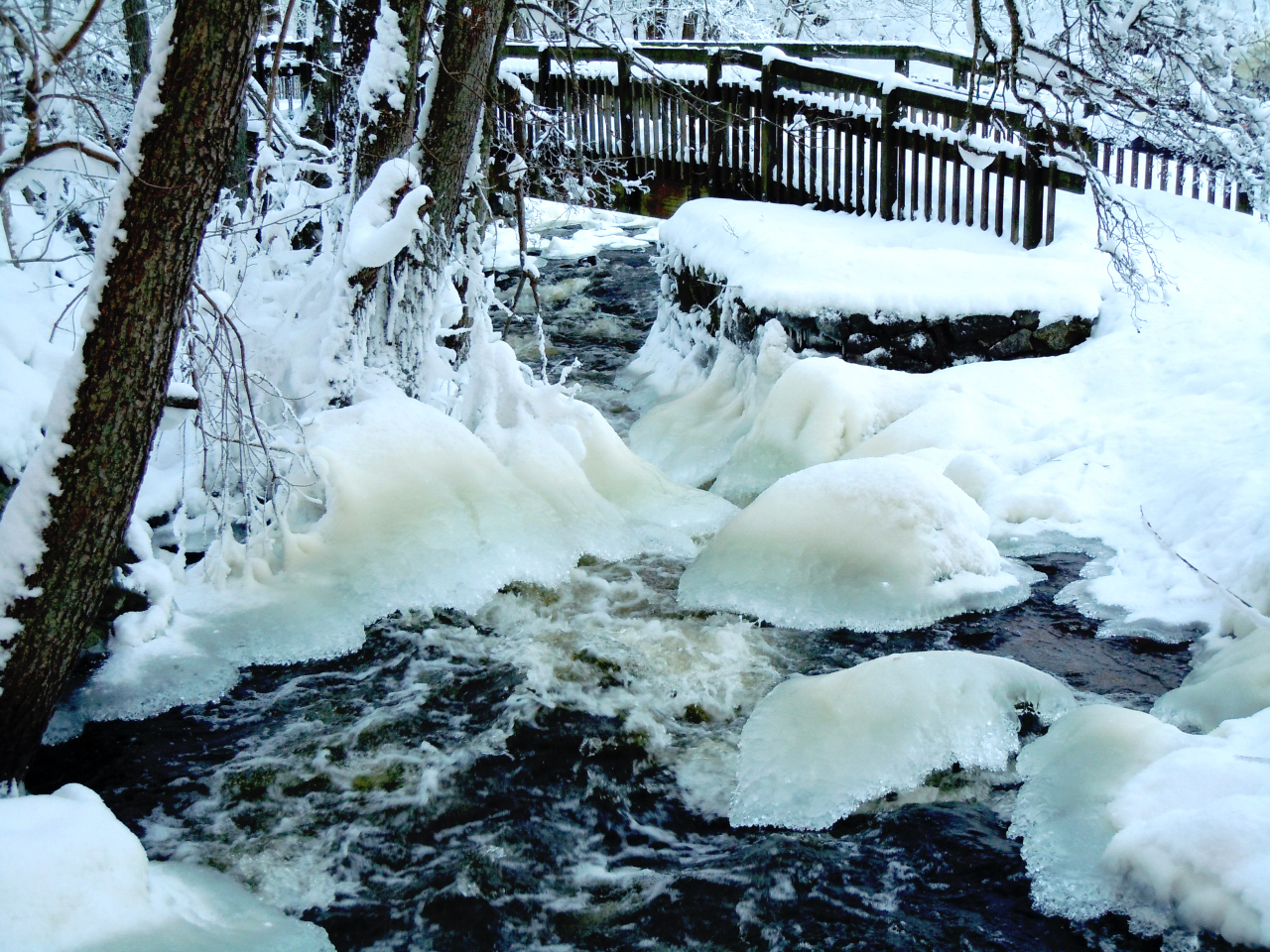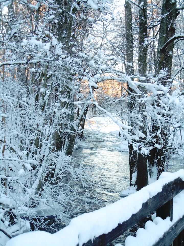 Då, ett par dagar före jul, snöade det när vi for från Väsby och snöandet tilltog ju längre söder och öster ut vi kom och vi såg att det var helt andra mängder som kommit härutåt kusten och de låg tungt på tallgrenarna. Vi började ana att de nog inte hunnit ploga alla småvägar och vi svängde med stor tvekan in på Nyforsvägen, men sen var det för sent. Man hade röjt en bilbredd och det fanns ingenstans att vända och då vi kunde ana parkeringen, var det stopp, allt låg under ett djupt snötäcke och vi kom inte längre, vi kunde höra forsen men det fanns ingen väg vare sej att gå eller åka på. Vi satt fast i en snödriva och snälla kringboende kom och undrade vart i all världenvi var på väg. Jag blev tvungen att peka på Lasse och säja, han är född där nere och vi är på en nostalgitripp. ÅHÅ, jasså är det du det jaha, jag har skickat bilder på dej och din mamma till Hembygdsföreningen. Sen blev vi hjälpta loss medan de berättade hur många strömstarar som höll till i forsarna och att det var jättemycket vatten. Det var lite förargligt att vara så nära och ändå inte se, bara höra.