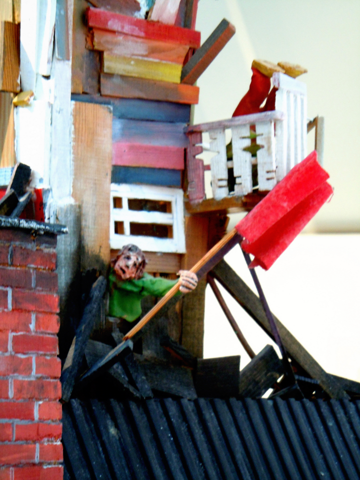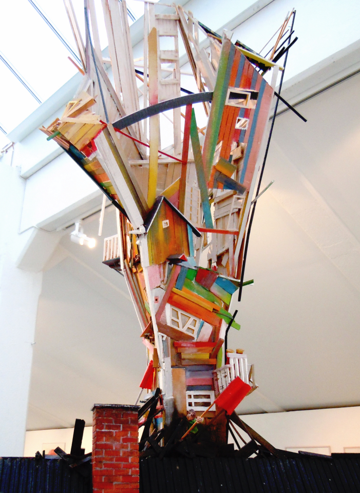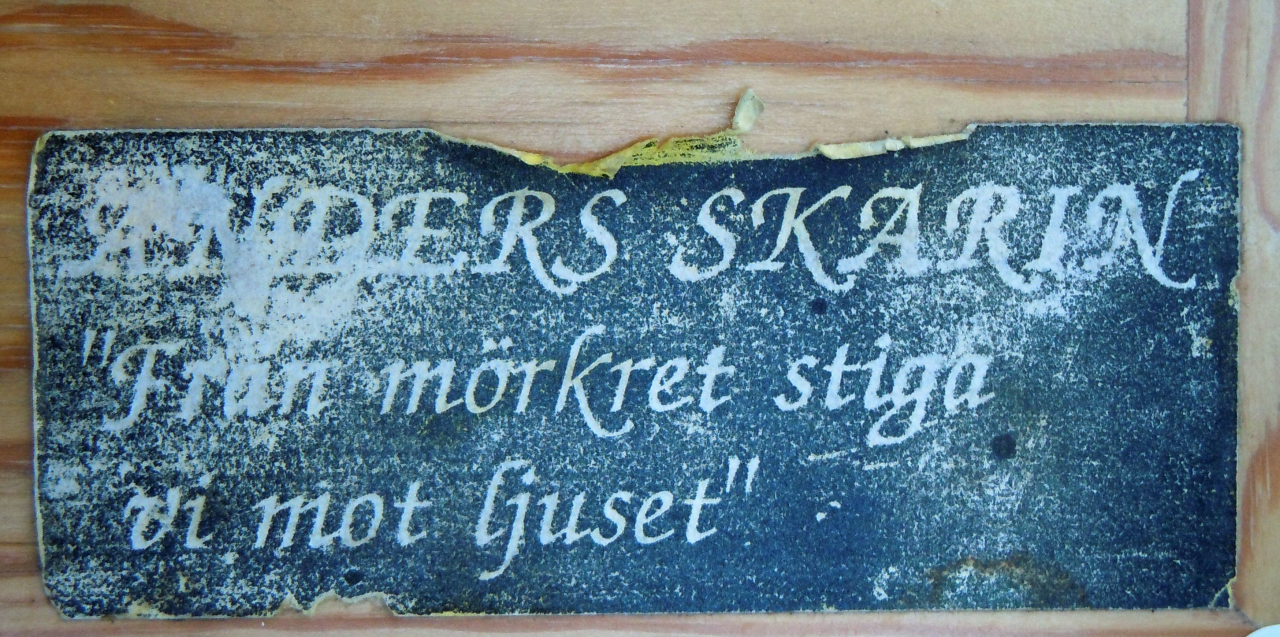 Sen längst ner i ena salen på en pall står ett husbygge som gör att det river till lite. Från mörkret stiga vi mot ljuset av Anders Skarin, vet inte vilket år den inköptes och vilka frågor konstnären brottats med, något lokalt, generellt eller folkhemmet. Den är i alla fall rolig att se från flera håll.