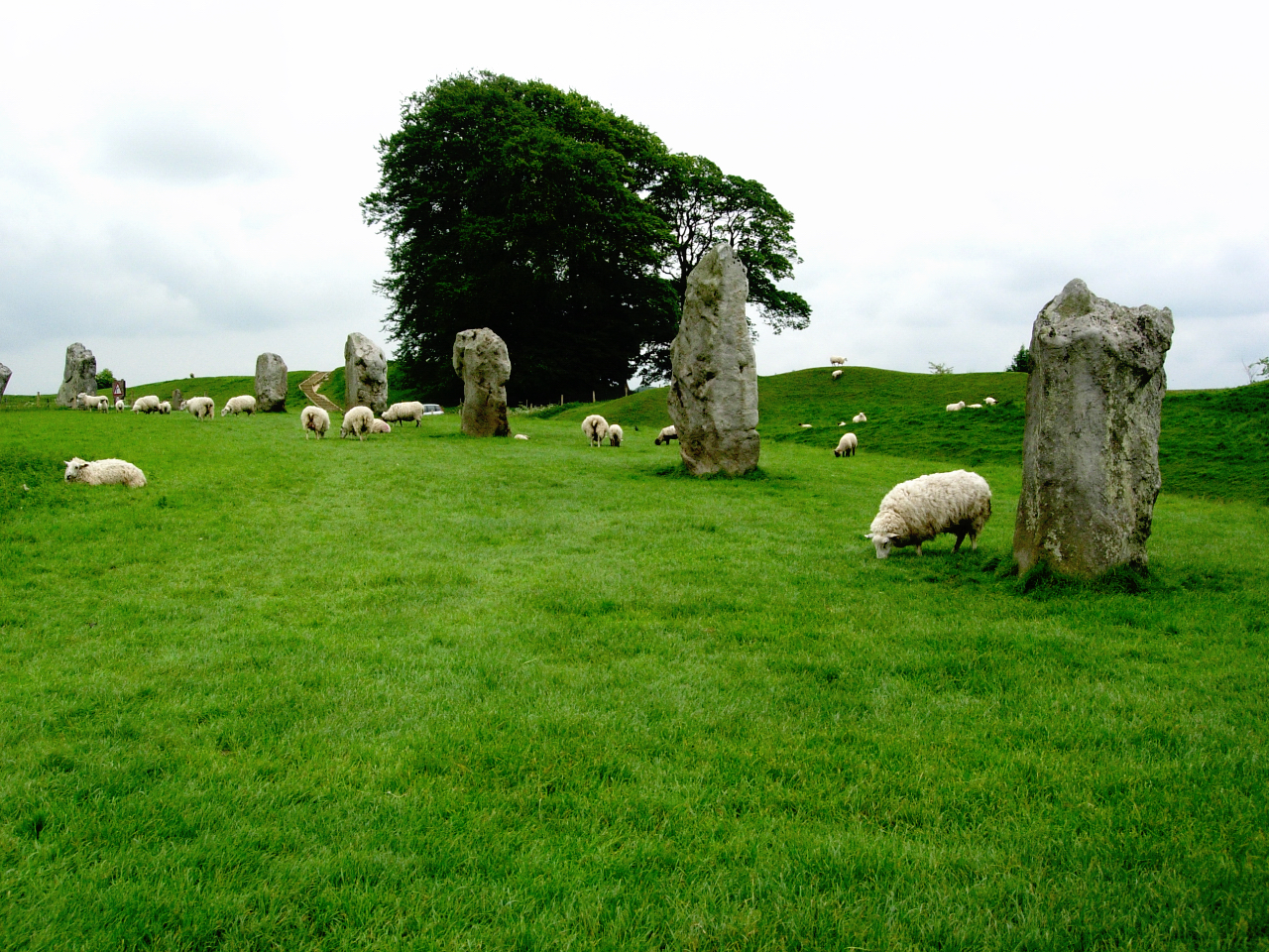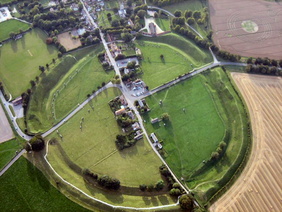 Nästa uppehåll var Avebury med Europas största stencirkel, den nämns ofta i samma andetag som Stonehenge och är (var) enligt arkeologerna vid Freskati den mest spännande av de två, den upptar mycket större yta och kan inte avgränsas effektivt, för en by har fått växa ut intill och innanför anläggningen. Det började för kanske mer än 5000 år sedan med att man grävde ett enormt dike 11 meter djupt och 21 meter brett och med en diameter på 420 meter runt en yta och utanför det en vall av det uppgrävda. Det kallar man en ”henge” (vallgrav?) och den finns runt de flesta stencirklar. Innanför ”hengen” restes sedan stora stenar i en cirkel och här är det svårt att få en överblick av anläggningen från marken.