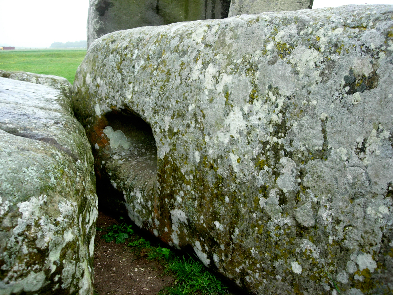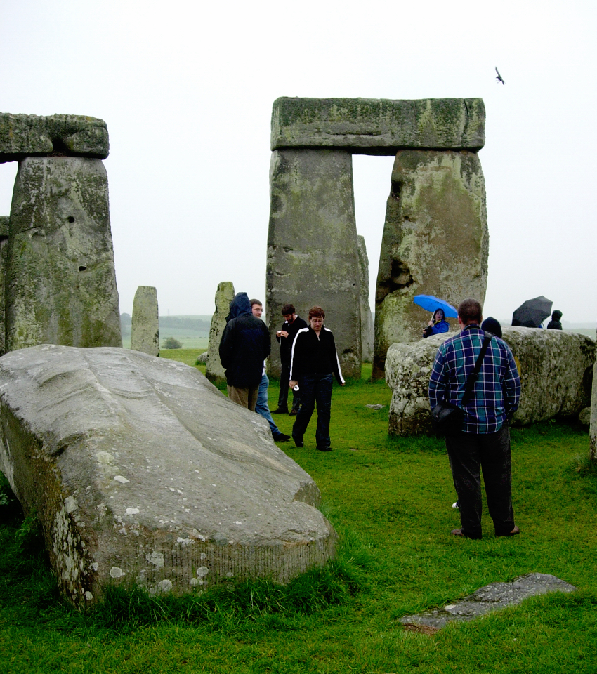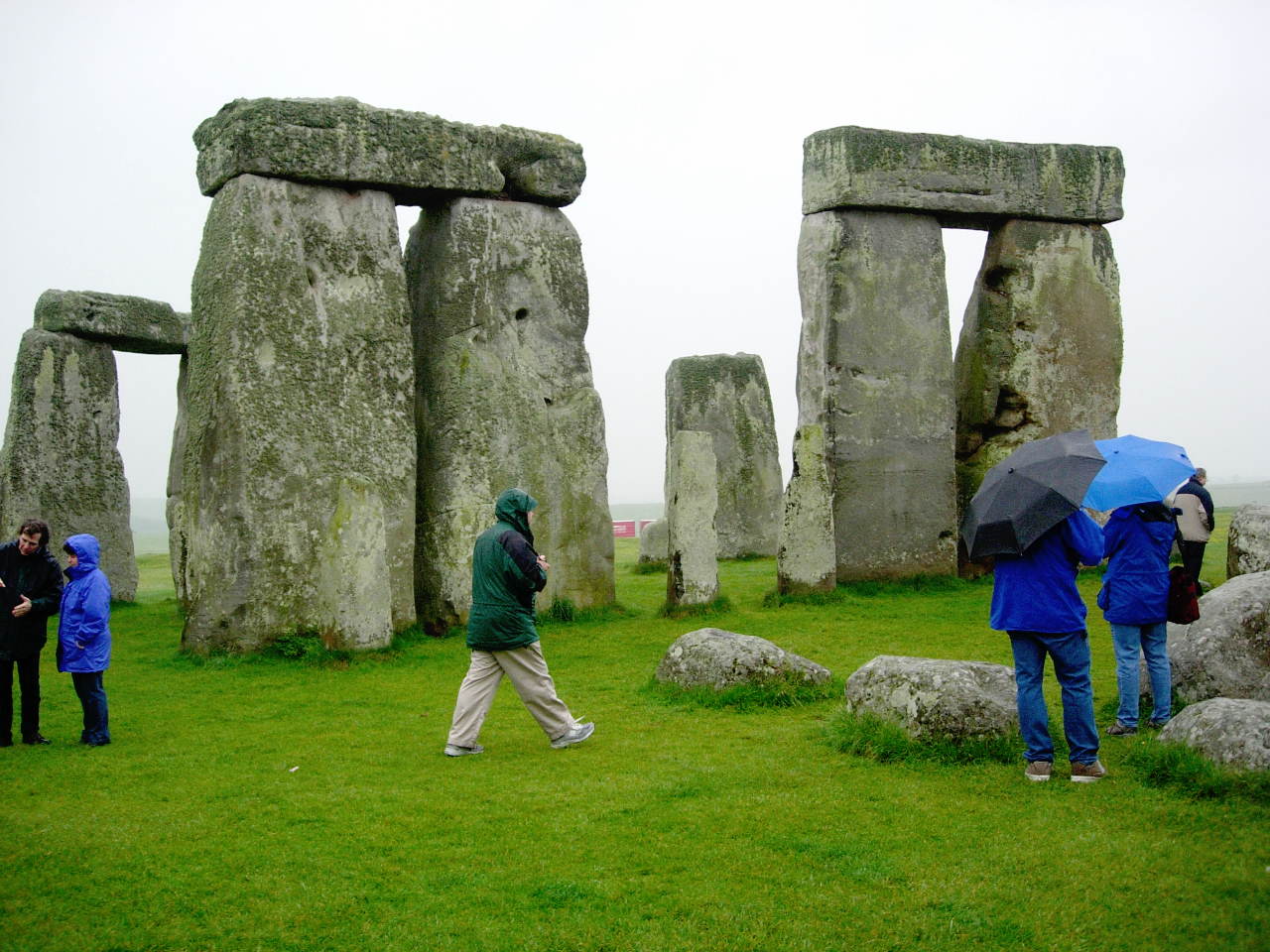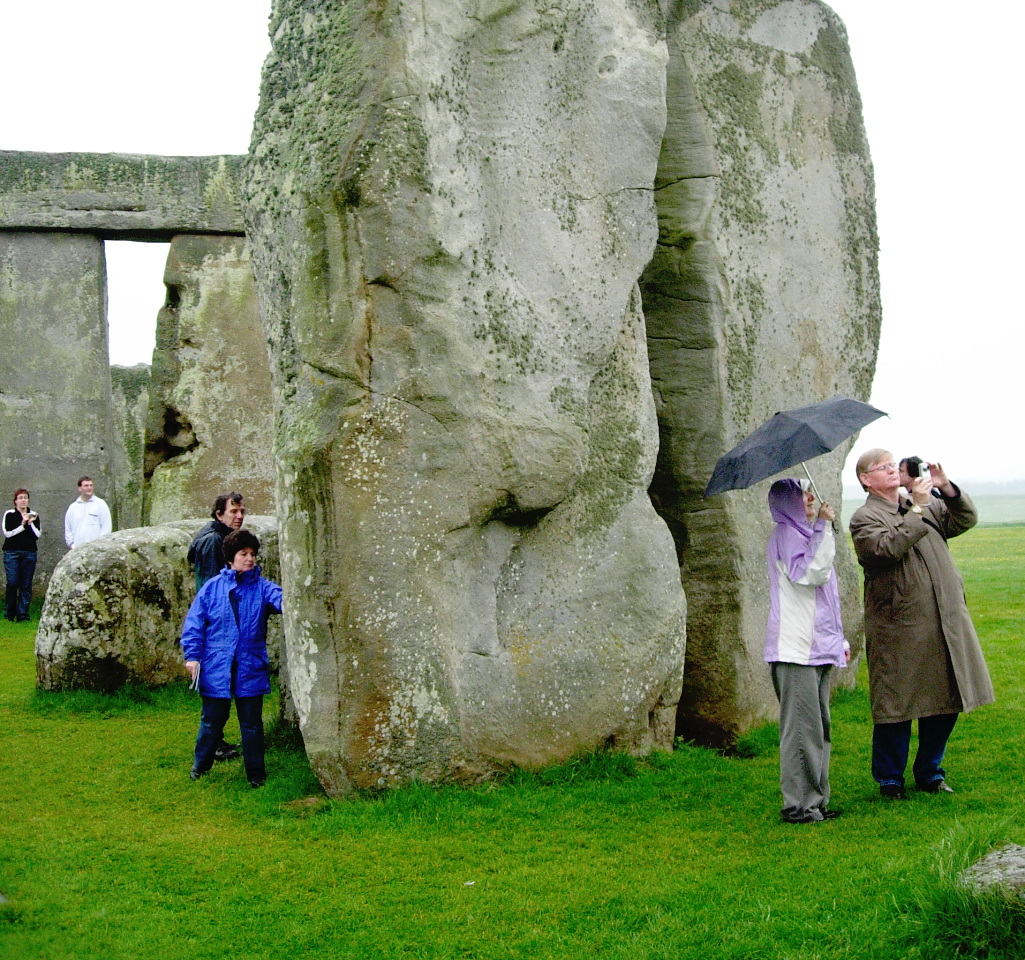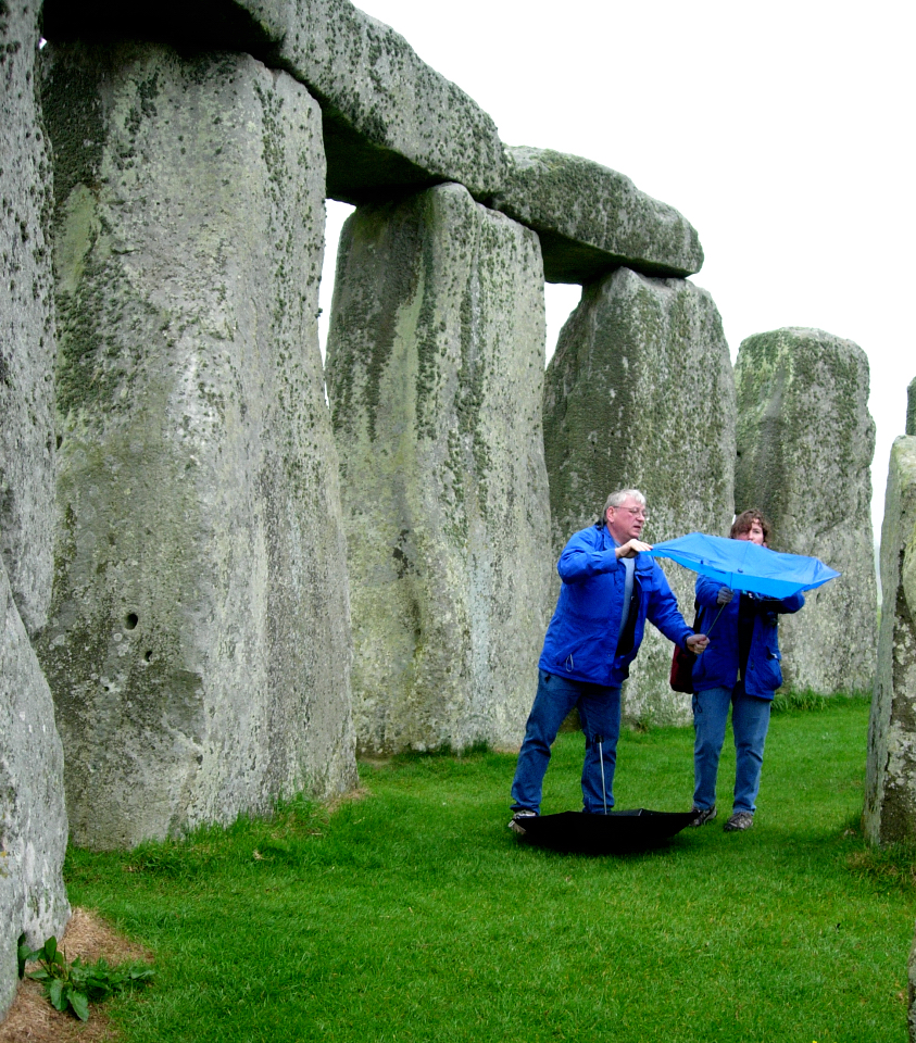 Vid vårt besök regnade det och inte förrän man ser paraplyerna på bilderna minns man regnvädret. Stonehenge har också ett dike och en vall kring sej och stenarna är monumentala. Frakten av dem hit och resningen var stordåd hur det än har gått till. För en del stenar i monumentet ”blåstenarna” har man spårat ursprunget till  Preselibergen i Wales 24 mil härifrån. De består till största delen av diabas och lär skimra i blått när de fuktas. Vattnet som strömmar vid stenbrottet i Wales sägs vara läkande och några sentida forskare vill tro att även stenen tilltrotts den kraften och att Stonehenge varit en vallfartsort för sjuka och skadade människor. Tolkningarna om användningen av Stonehenge är och har varit många och blir säkert fler, man kan bara förundras då man står intill de stora stenarna.