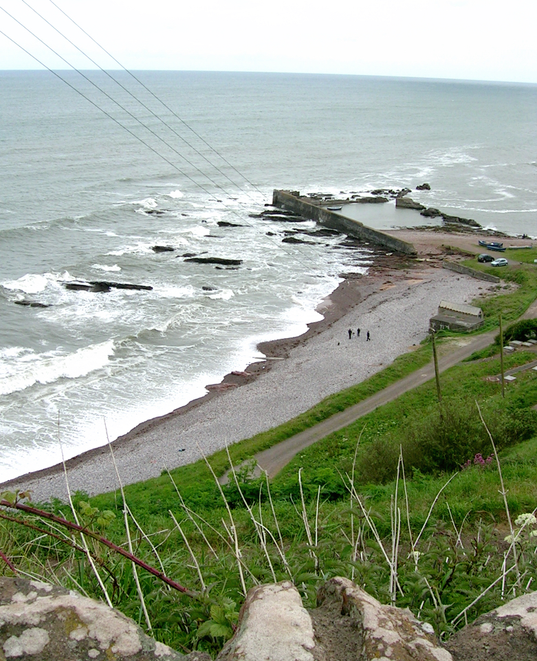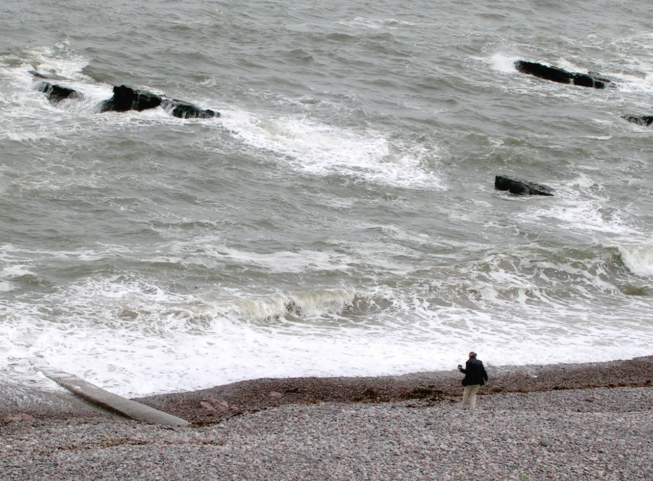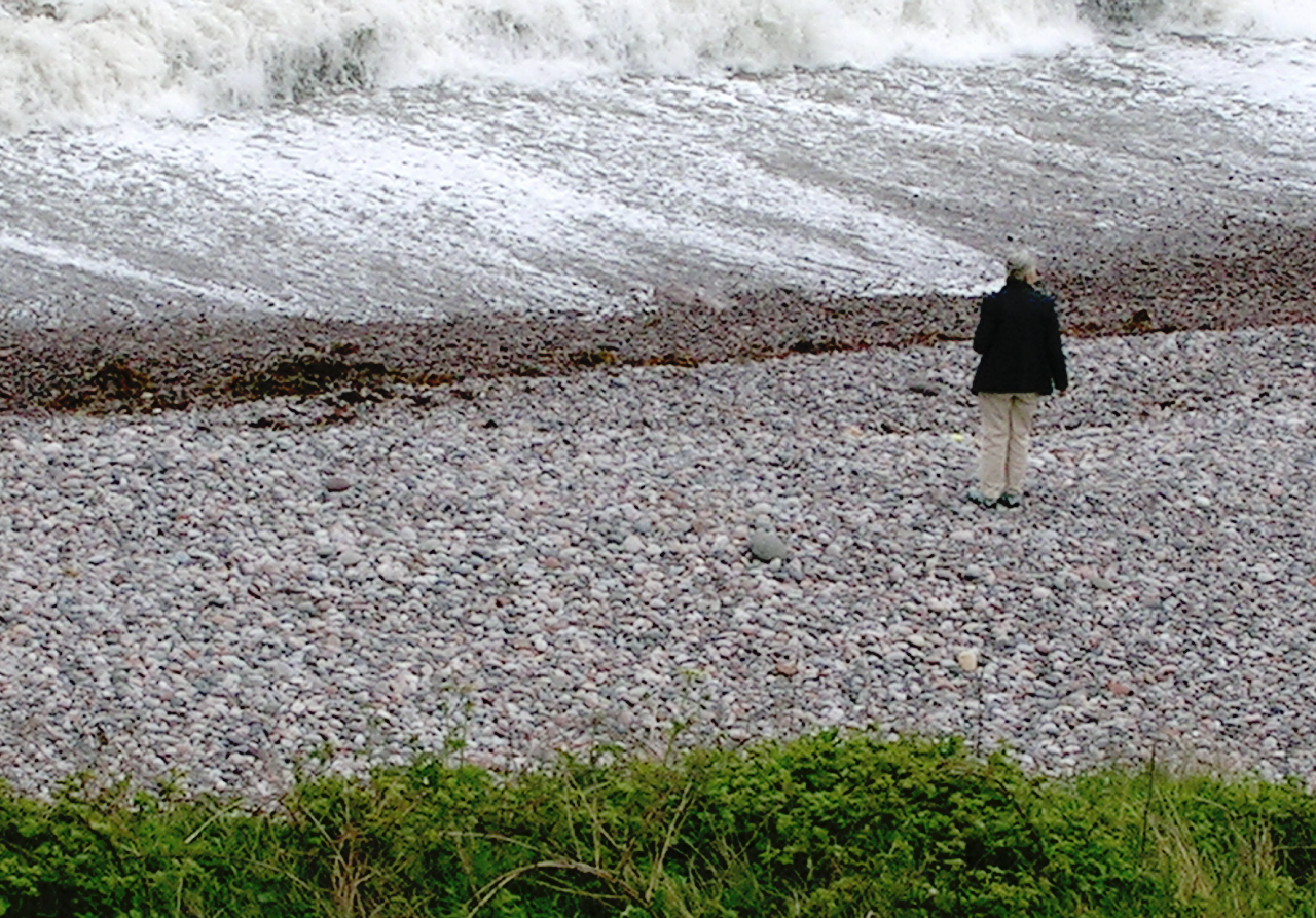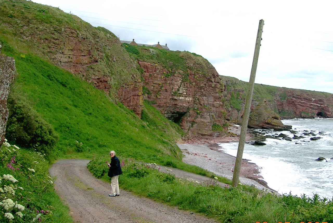 Fred och Margaret skjutsade oss till Auchmithie, var inte säker på att hitta dit längre, det är en plats i utkanten av Arbroath, någon kilometer norr om med röda sansdstensklippor fulla av havsslipade stenar. Stranden mellan klipporna består av de framvaskade stenarna och de rasslar öronbedövande när vågorna slår in. Om man varit där kan man inte glömma platsen, man blir berörd om inte annat så av ljudet, vinden, stupen och allt det röda. Vi är alla lika gamla och ingen ville eller orkade följa med mej ner till vattnet och stenrasslet.