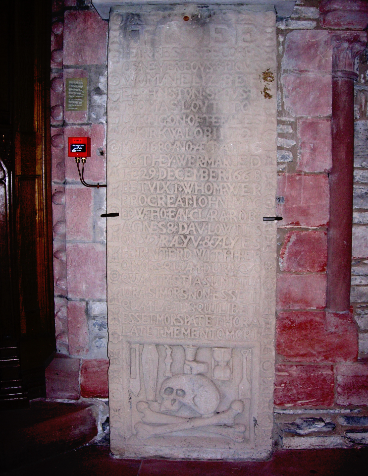 De gamla gravstenarna inne i kyrkan hade alla upptill eller nertill bilden av en dödskalle med korslagda knotor under.
