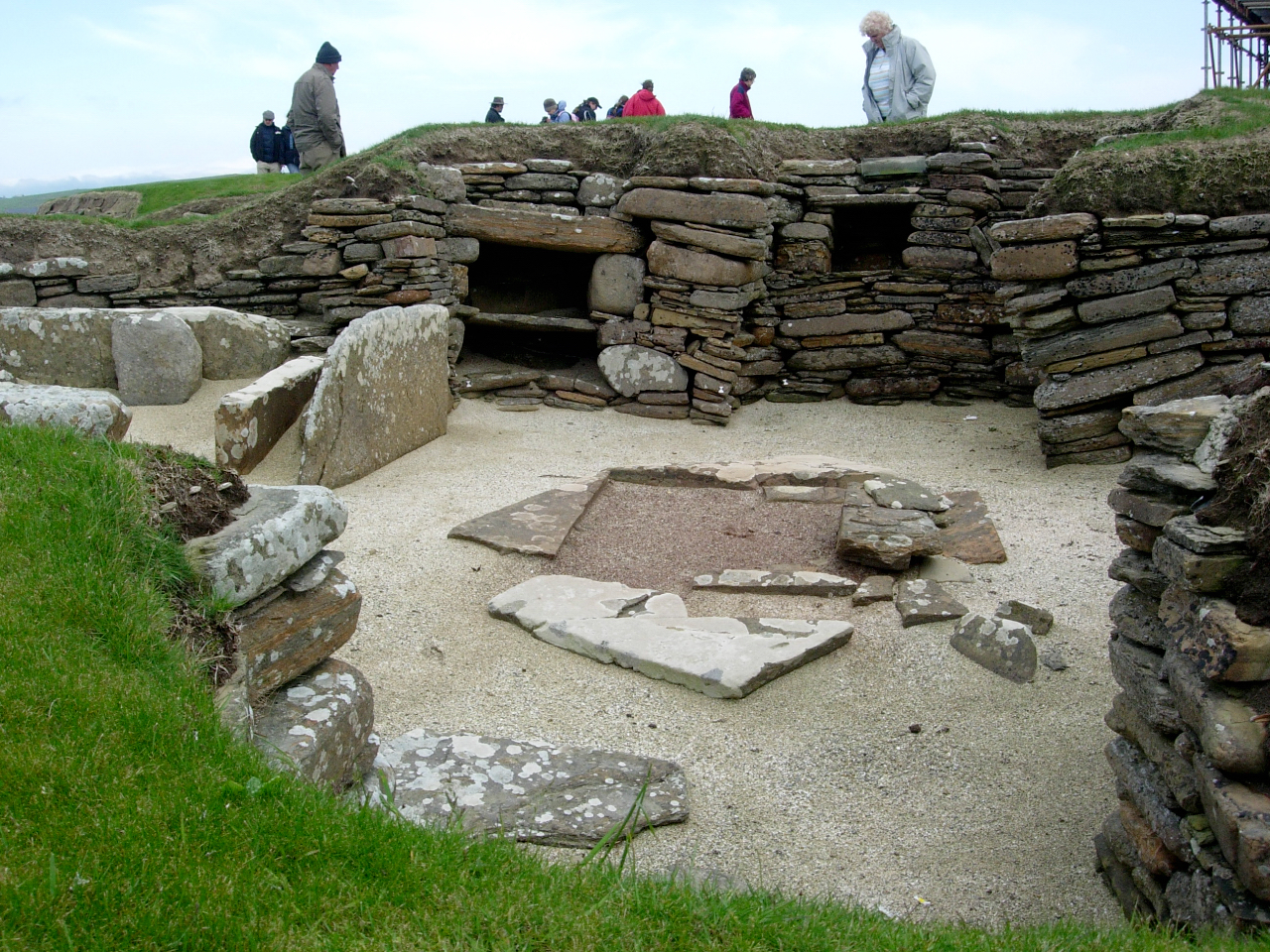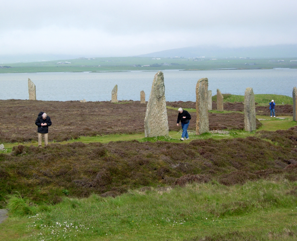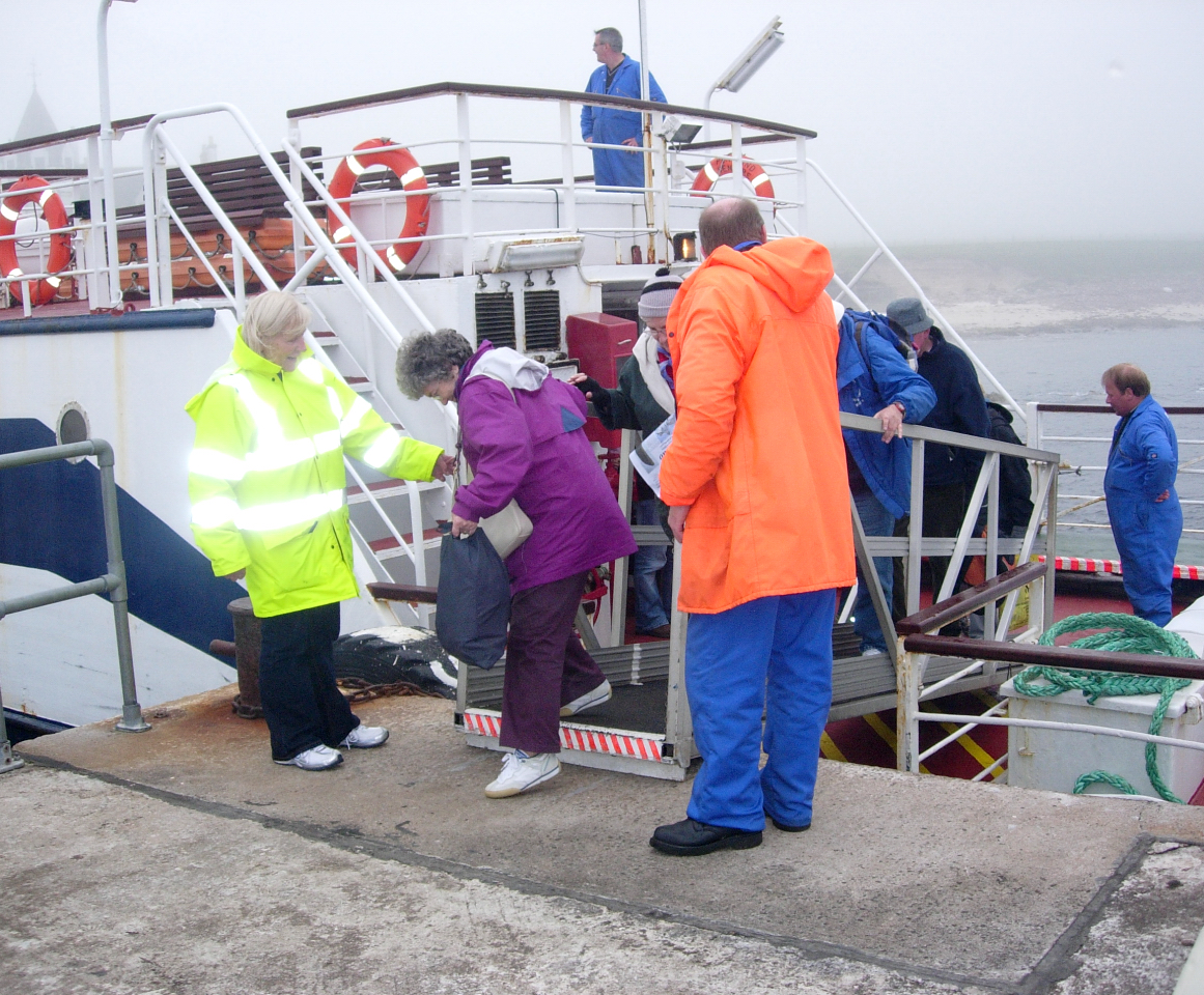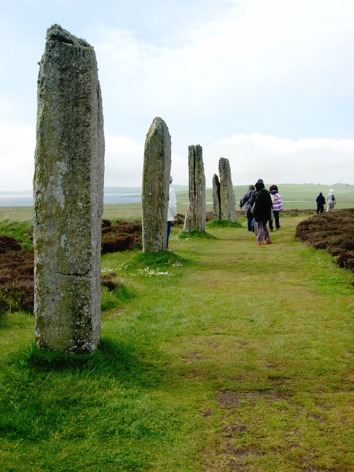 Båtfärden tog bara någon timme över ett stort djup, det var dimma och vädret var på gränsen för inställd resa, här kunde vara gungigt och i en halvtimme blev det hemska gropar och höjder, de plastfodrade hinkarna rullade kring på golvet och vi höll i oss och spejade efter land. Vi hade köpt en ”Maxi Day Tour” och en buss skulle ta oss runt alla sevärdheterna på Orkneys sammanhängande större öar. Den väntade i Burwick och chauffören var guide. Han var öbo och talade i ett och med en annan melodi än skottarna och det var riktigt svårt att hänga med. Orkney heter här Orni, k framför n uttalas inte. Orkney var norskt en längre tid och man hade eget språk – norn, en fornnordisk dialekt men det förbjöds på 1800-talet fast melodin i det språket finns kvar i den nutida Orkney-skotskan.