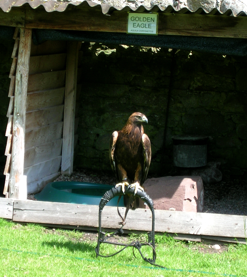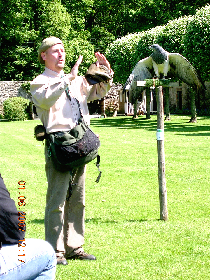 Vi skyndade oss ner och fick vara med om en föreställning vi aldrig väntat oss. En man, ägaren till Dunrobin Castle hade ett antal rovfåglar som han tränat att komma på olika signaler, visslingar och som belönades med vad vi trodde var köttbitar men som visade sej vara även råttor (döda) , när de landade på hans arm efter utfört arbete. Han var falkenerare.
