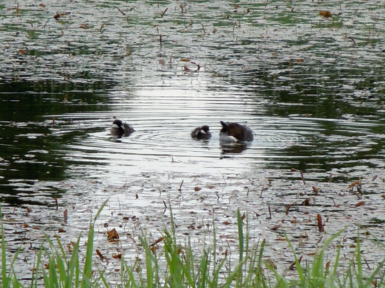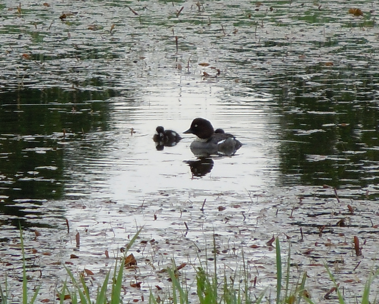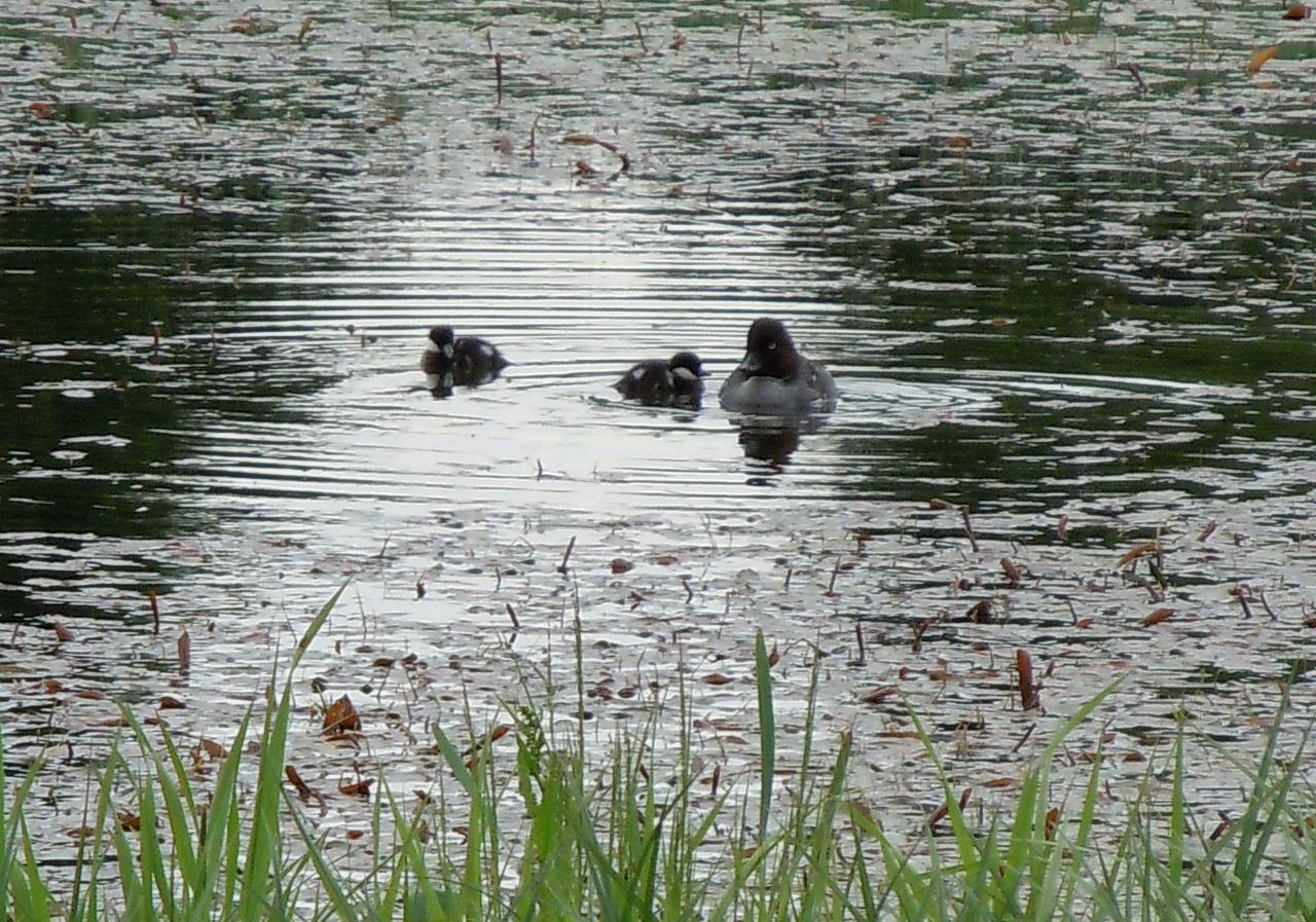 Men det rörde sej i en yta mitt i ena dammen, en fågel med brunt huvud och med två små dunbollar arbetade sej runt, det gick inte att se på så långt håll vad det kunde vara så jag lät kameran titta i stället och bläddrade sedan i Lars Jonssons fågelbok och kom fram till att de liknade hans knipor, men ungarna med vita kinder finns ingen bild på.