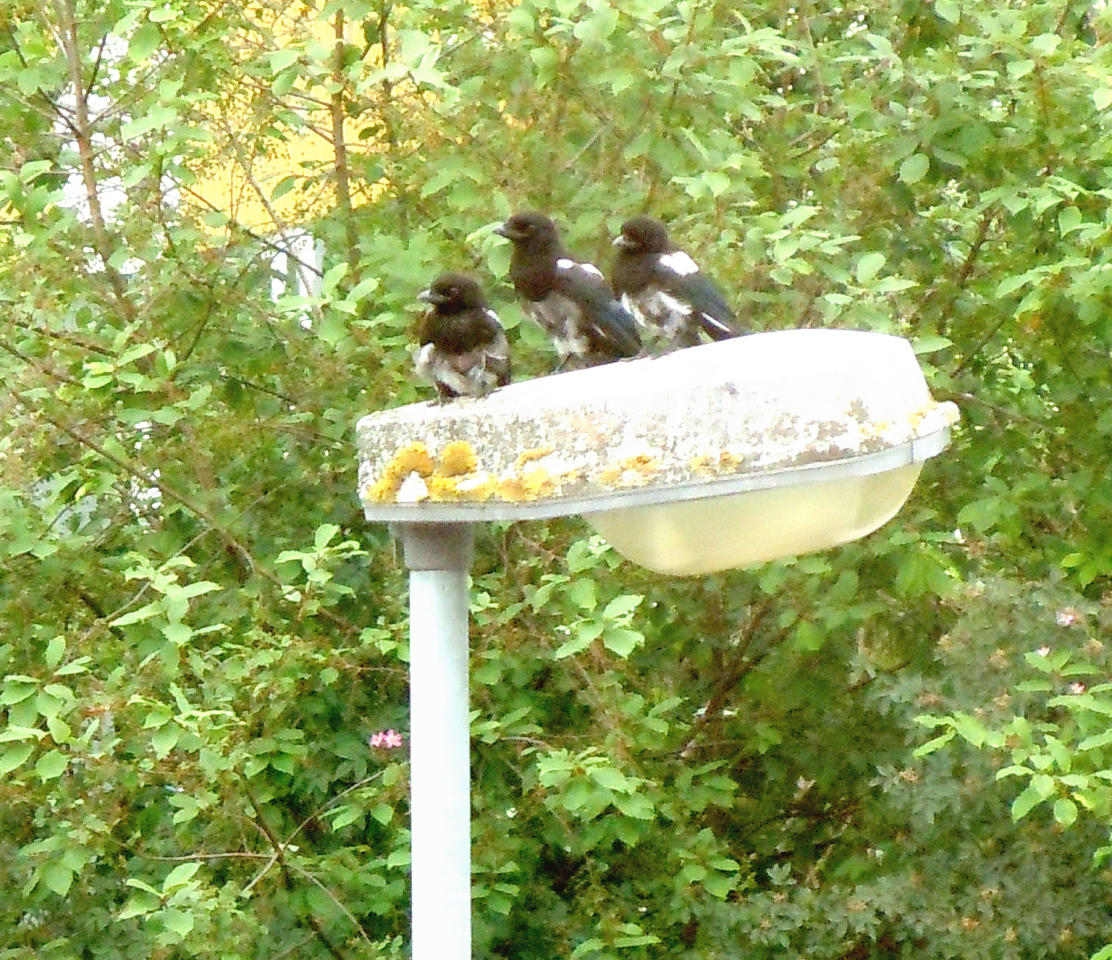 Jag fick syn på dem utanför sovrumsfönstret för några dagar sedan. Skatmamman hade samlat sina ungar överst på lyktstolpen och de hade inte mycket till vingar eller stjärt. De såg lite tveksamma ut men så fort jag försökte öppna fönstret flög de iväg en efter en och sen har de inte visat sej där igen.